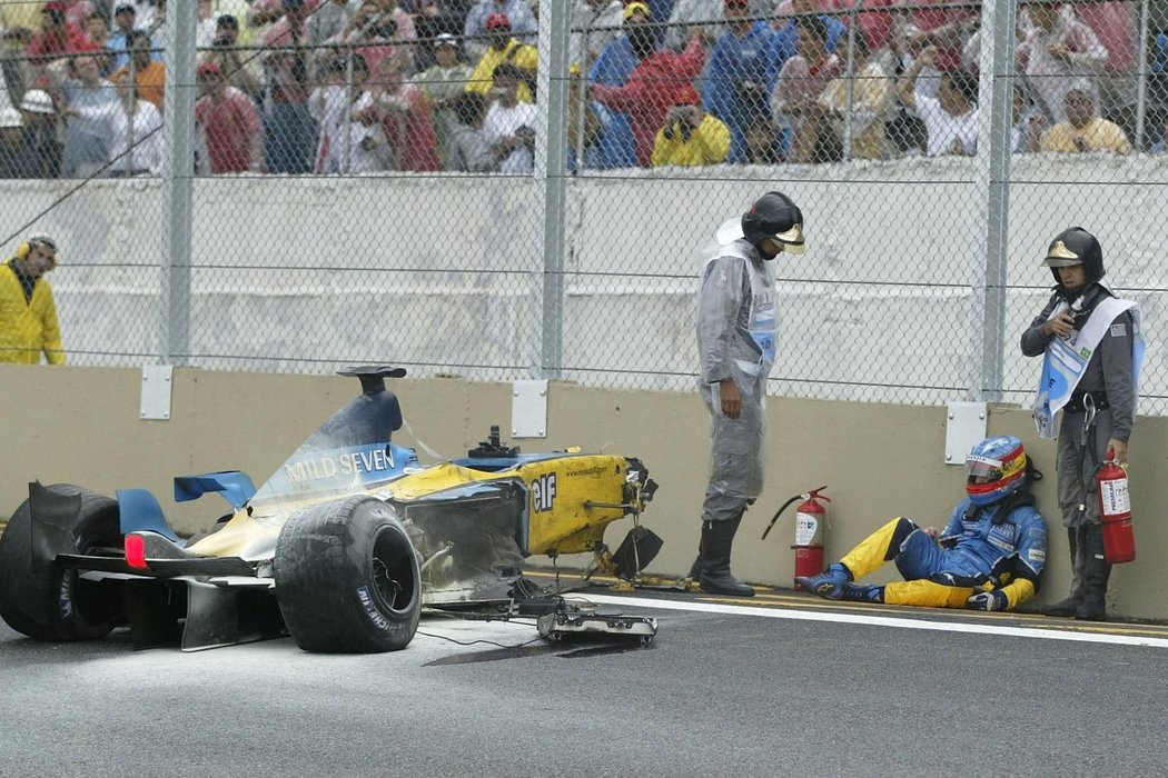 Essa corrida teve um caos típico do Grande Prêmio do Brasil. Na pista molhada, Mark Webber perdeu o controle do carro e bateu no muro da Subida dos Boxes. Alonso atropelou os destroços e… pau na barreira de pneus do lado interno da pista. Ele ainda foi o terceiro colocado (porque a corrida foi encerrada naquele instante, em bandeira vermelha, e ficou valendo o resultado de duas voltas antes), mas teve de faltar ao pódio porque estava zureta da pancada.