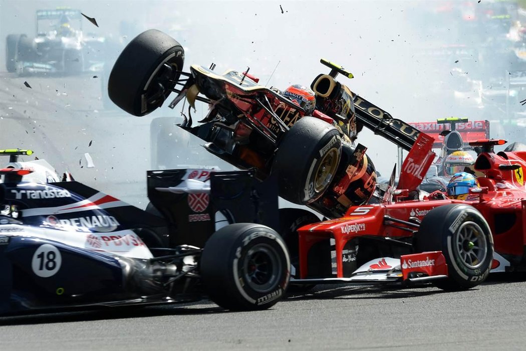 Romain Grosjean calculou mal a freada para a primeira curva e saiu acertando todo mundo como se fosse uma bola de boliche. Decolou e passou voando por cima da cabeça de Alonso, triscando no capacete dele. Esse acidente rendeu punição severa a Grosjean – que foi impedido de participar da prova seguinte – e ajudou também a reforçar a discussão em torno da adoção do halo, que seria efetivada agora em 2018.