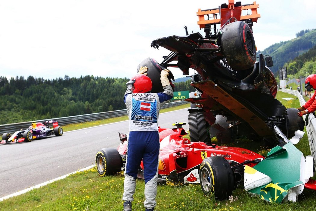 Na vida é assim: uma hora você está por baixo, outra hora você está por cima. Aqui, Alonso decolou sobre o carro de Kimi Raikkonen na primeira volta do GP da Áustria. Apesar da imagem assustadora, os dois bateram a poeira dos ombros e voltaram de boa para os boxes.