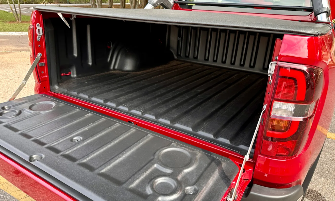 A caçamba da Titano mede 1,630 metro de comprimento, 1,600 metro de largura e 51,6 cm de altura, com capacidade de carga de 1.020 quilos ou volumétrica de 1.314 litros – semelhante à das rivais médias e superior à da dupla Strada (650 quilos e 844 litros) e Toro (1.010 quilos e 937 litros). Um ponto positivo é o protetor de caçamba e a capota marítima oferecidos de série, enquanto algumas rivais cobram à parte por eles.