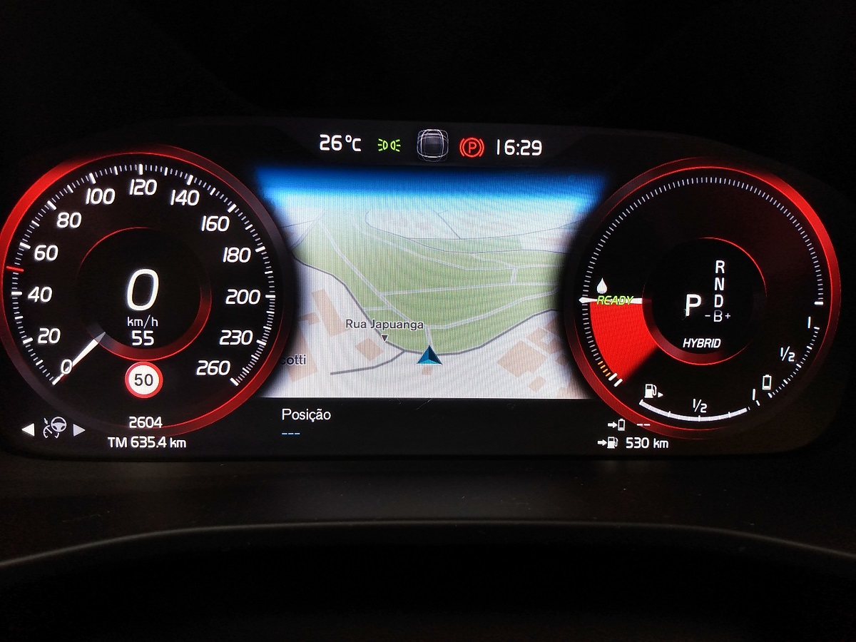 É possível atuar apenas com o motor elétrico. O barulho e a emissão ficam no zero a zero. Neste caso (com a força armazenada nas baterias de íons de lítio, com 10.7 kWh), a autonomia é de 47 quilômetros, informa a marca sueca. Todo o procedimento de uso é exibido na tela TFT de 12,3″, vulgo quadro de instrumentos digital.