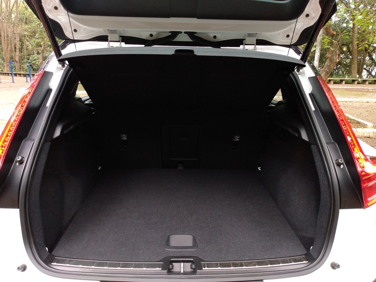 Voltando a falar do comportamento do XC40 Plug-In Hybrid R-Design, na cabine, os ocupantes são extremamente bem tratados. O interior continua com a pegada esportiva da versão anterior, com destaque para os bancos forrados de couro e o teto solar elétrico panorâmico. O isolamento acústico é extremamente agradável e o acerto da suspensão, mesmo firme, merece elogios. A tração é apenas dianteira, entretanto, nada de o SUV escapar nas curvas.