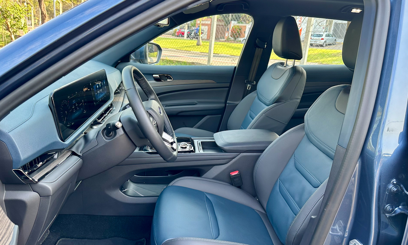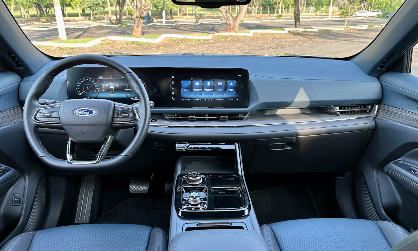 Outro elemento que reflete a evolução, é o interior. O Ford Territory tem acabamento bem acima da média, se equiparando ao Jeep Compass e ao GWM Haval H6 em qualidade. Toda a porção superior do painel e das portas, revestida em material azul, é bem macia. Há faixas em couro preto nas portas, console e painel, igualmente macias.