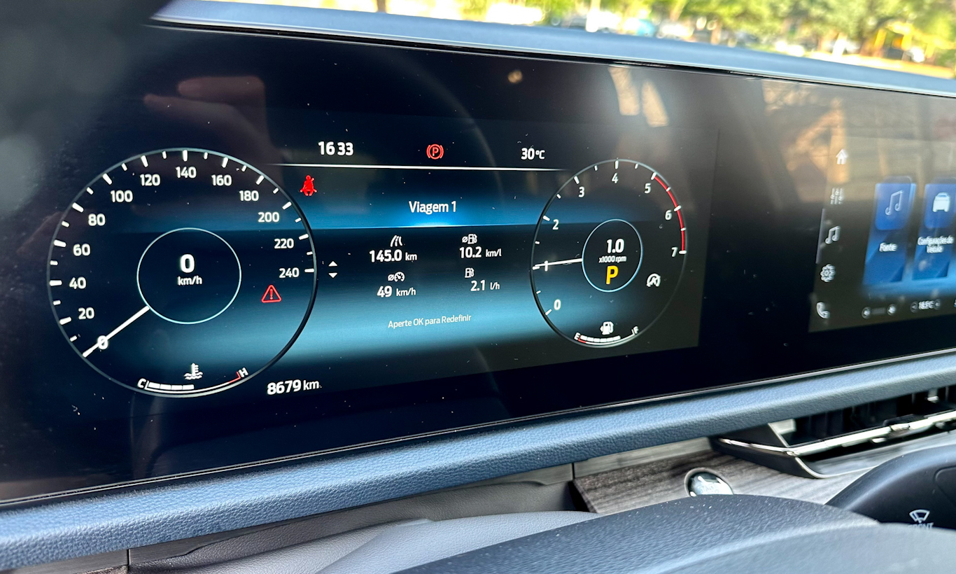 Temos ainda botões no volante que cumprem função dupla ao ser selecionada através de outro botão essa função. Mas é comum confundir e esquecer da ativação e fazer a maior bagunça. O painel de instrumentos digital tem gráficos com letras pequenas e faltam informações importantes acessíveis o tempo todo, como autonomia.