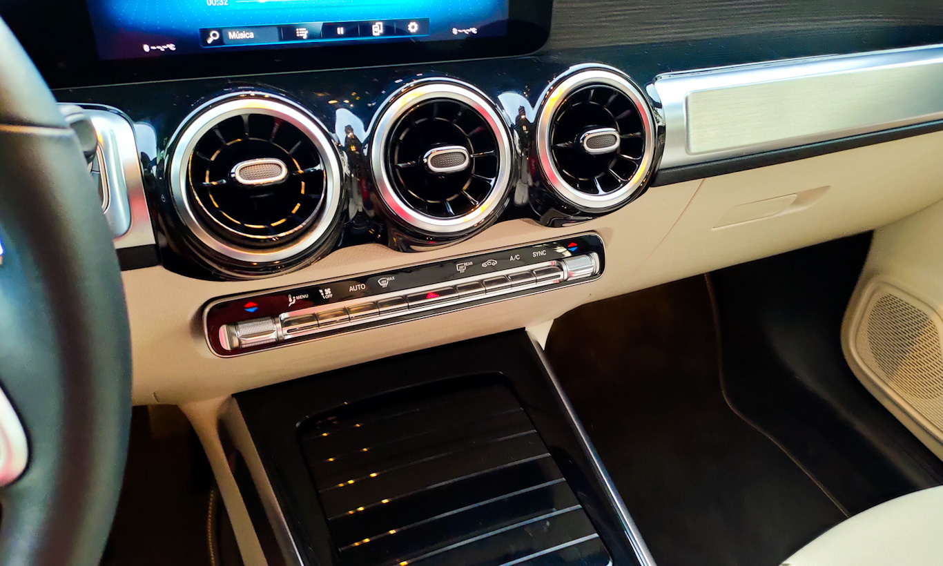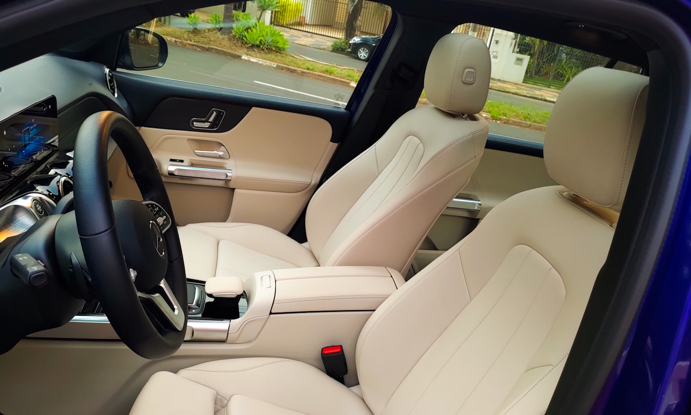 Ele ainda traz um sistema chamado cinética dos bancos. Durante longas viagens ele faz pequenos ajustes no assento e no encosto para fazer com que o motorista se movimente e corrija a postura. Não há aquecimento ou resfriamento no GLB vendido no Brasil, infelizmente.