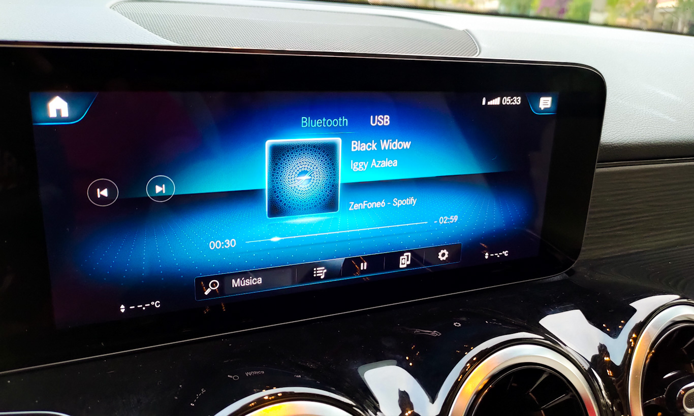 Já as teclas do lado direito controlam a central multimídia. A Mercedes-Benz possui um dos melhores e mais intuitivos sistemas. Ele é rápido, com tela de excelente qualidade e intuitivo. Pena não ter Android Auto ou Apple CarPlay sem fio. Além disso, o espelhamento de celular não ocupa toda a tela, outro defeito bem nítido.