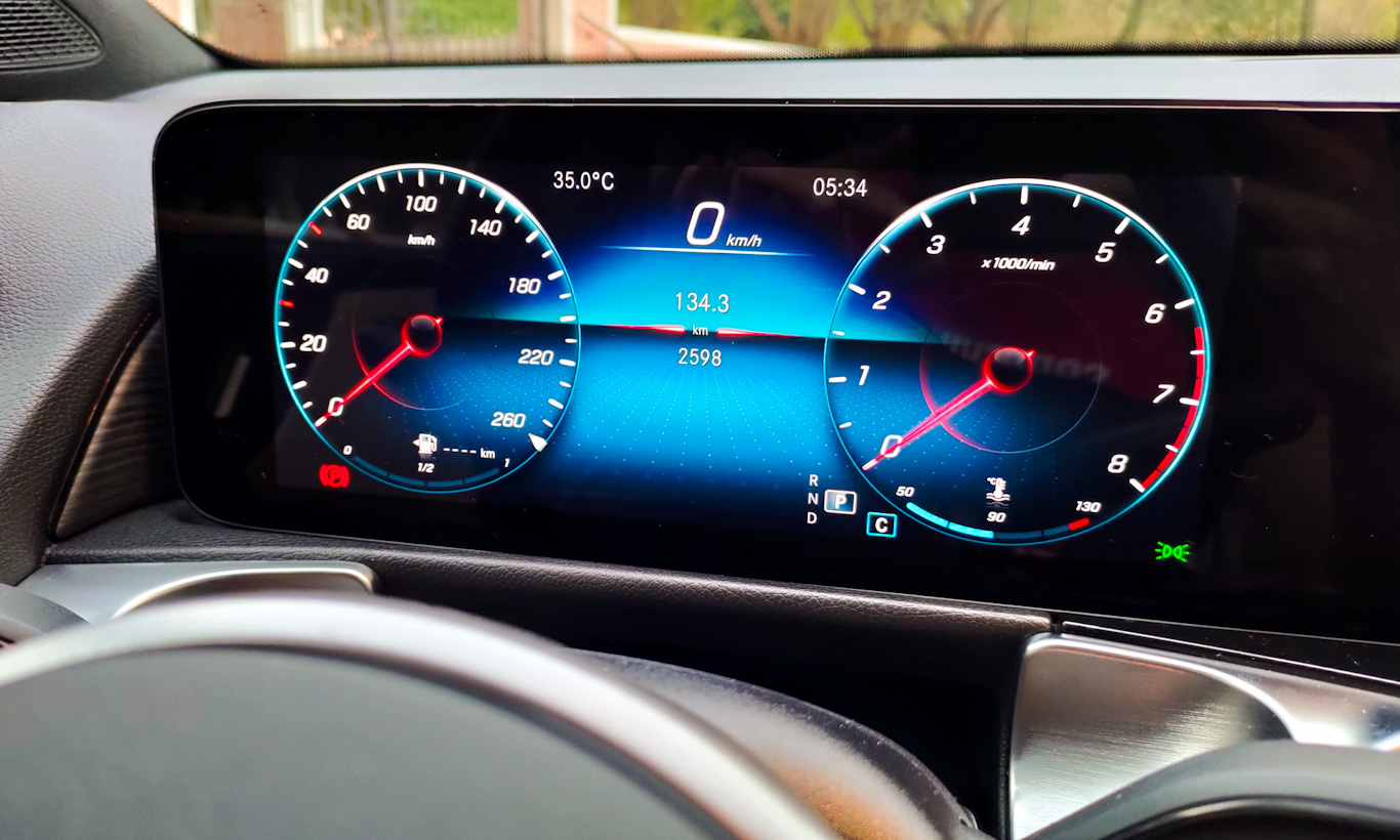 Atrás do volante, o painel de instrumentos totalmente digital é configurável e personalizável. É possível mudar a cor dos instrumentos, e também o que é exibido na frente do motorista com mais de cinco opções para cada lado e também para a parte central. Tudo é controlado pelo lado esquerdo do volante.