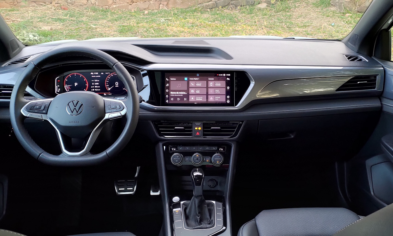 Tudo é bem montado e bem encaixado, mas fica longe da qualidade do Jeep Compass. Até mesmo o visual é tão tipicamente Volkswagen, que beira o sem graça. Destacam-se as duas telas, da central multimídia e do painel de instrumentos digital, além das faixas de LED com cores configuráveis.