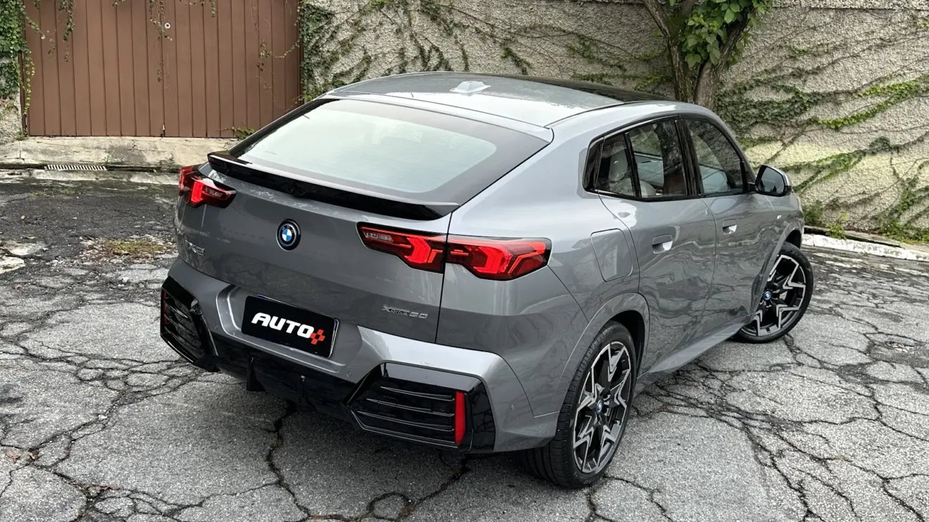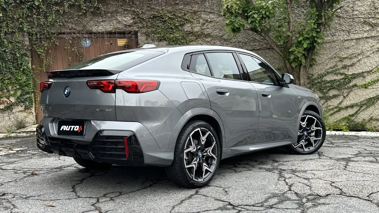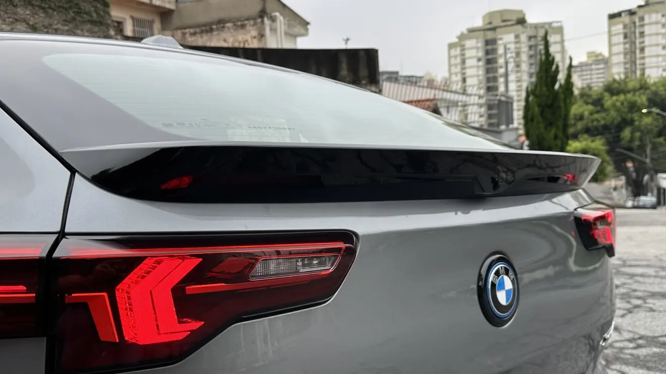 De toda forma, o iX2 adota uma escola estilística disruptiva dentro da BMW, alinhando-se aos traços do iX1 e do iX. Um detalhe é o spoiler integrado à tampa do compartimento de bagagens, além do design das lanternas traseiras, que conferem um toque de personalidade. As rodas de 20 polegadas desta versão xDrive30 M Sport são equipadas com pneus 245/40 em ambos os eixos.