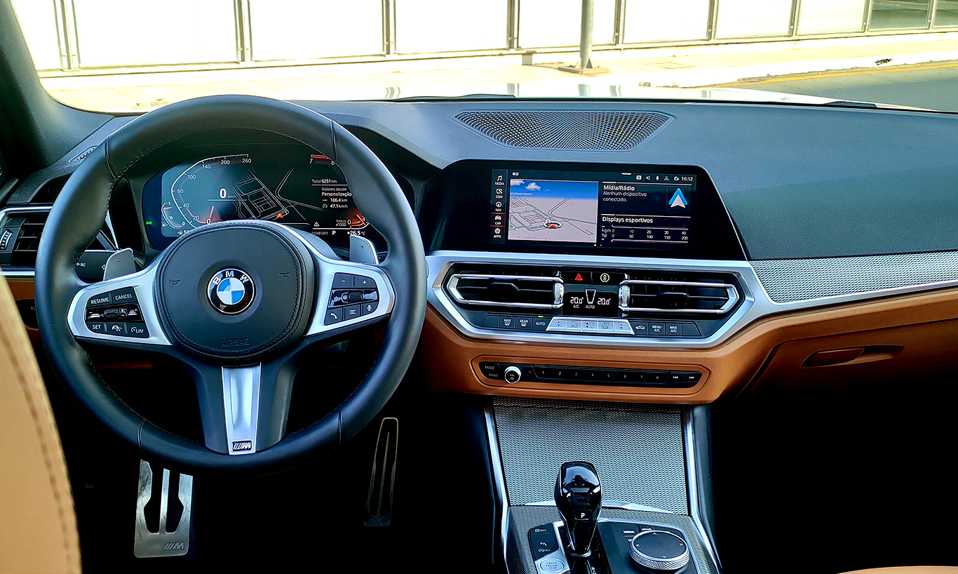 Enquanto os carros da Volvo têm interior minimalista e clean, os da BMW vão para o lado oposto. A opulência do luxo da BMW é pelo excesso, pelos detalhes a mais e pela grande quantidade de matérias diferentes. O caso do Série 3 passa longe de ser cafona, como alguns outros carros da marca beiram.