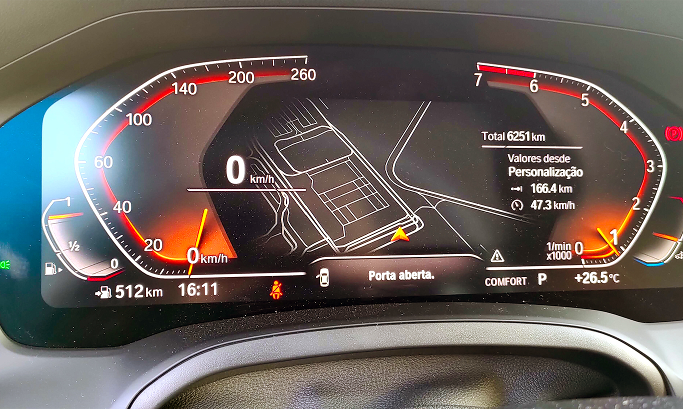 No quesito segurança, o 320i M Sport traz frenagem autônoma de emergência, assistente de manutenção em faixa, piloto automático adaptativo, alerta de ponto cego, sistema de câmeras 360° e alerta de tráfego cruzado (que confesso que me deu um baita susto ao sair da garagem e ele confundir uma sacola voando com um carro).