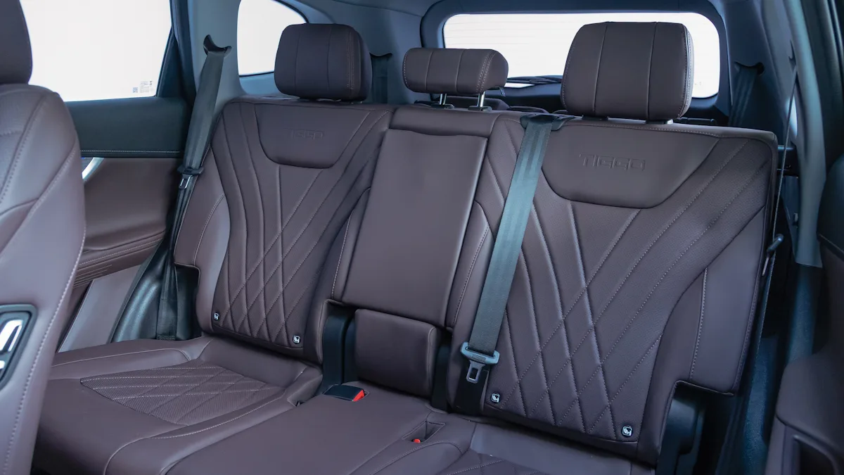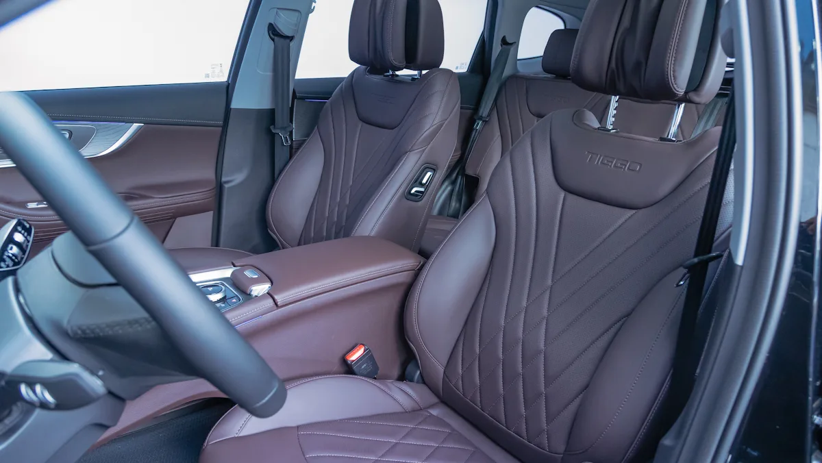 Além da melhoria no conjunto mecânico, a CAOA Chery também trouxe mais sofisticação para o interior do Tiggo 8 PHEV. Agora, o SUV tem revestimento interno em couro marrom, o que passa uma sensação de mais refinamento. É um material de qualidade, com toque agradável e presente nas portas, console central, bancos e painel.