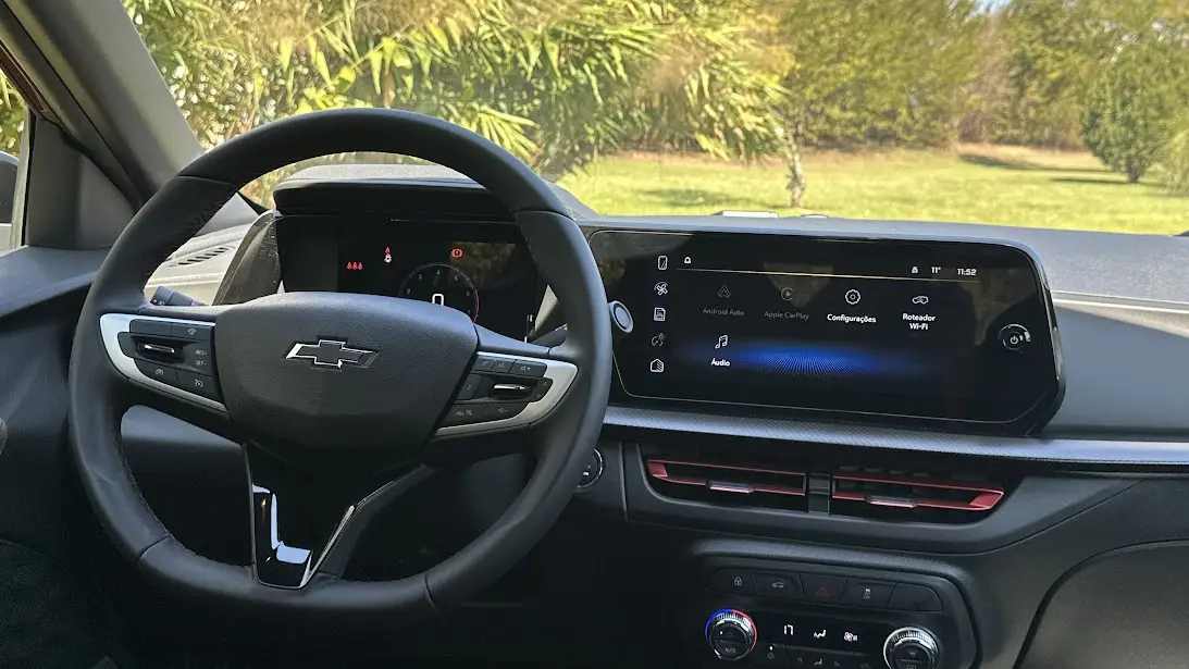 Ao abrir a porta, a cabine recebe bem os ocupantes. Uma novidade é o Cockpit Virtual, com quadro de instrumentos digital de oito polegadas integrado ao multimídia de 11 polegadas — estilo já adotado na Spin, no Tracker, na Montana e em modelos de segmentos superiores, como o SUV 100% elétrico Equinox EV.