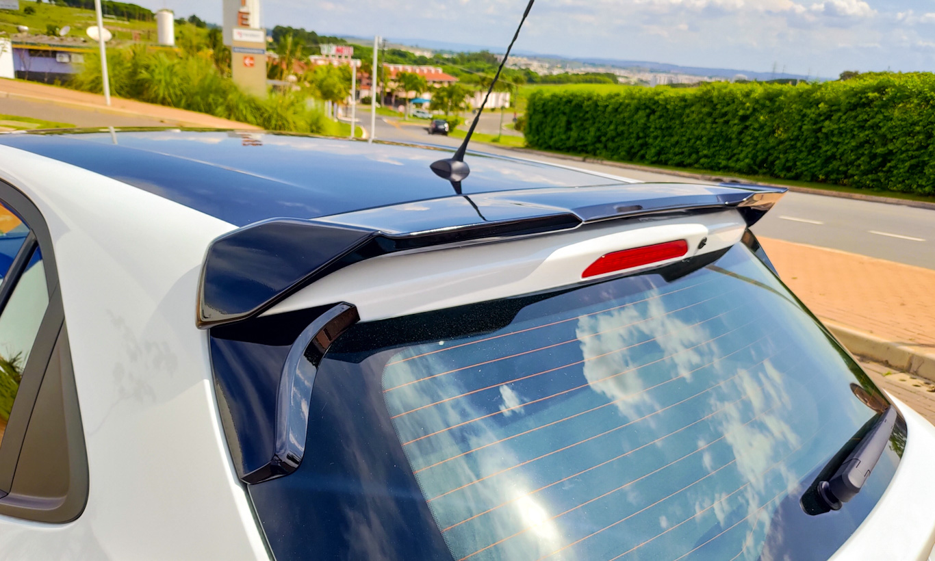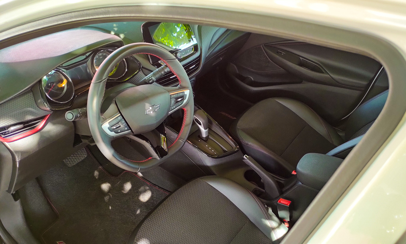 Adicione à conta saias laterais, rodas de liga-leve de 16 polegadas em preto, aerofólio traseiro, falso extrator de ar, além de teto e retrovisores pintados em um belo tom preto metálico. A gravatinha da Chevrolet é preta nessa versão em todos os lugares, menos, ironicamente, na chave.