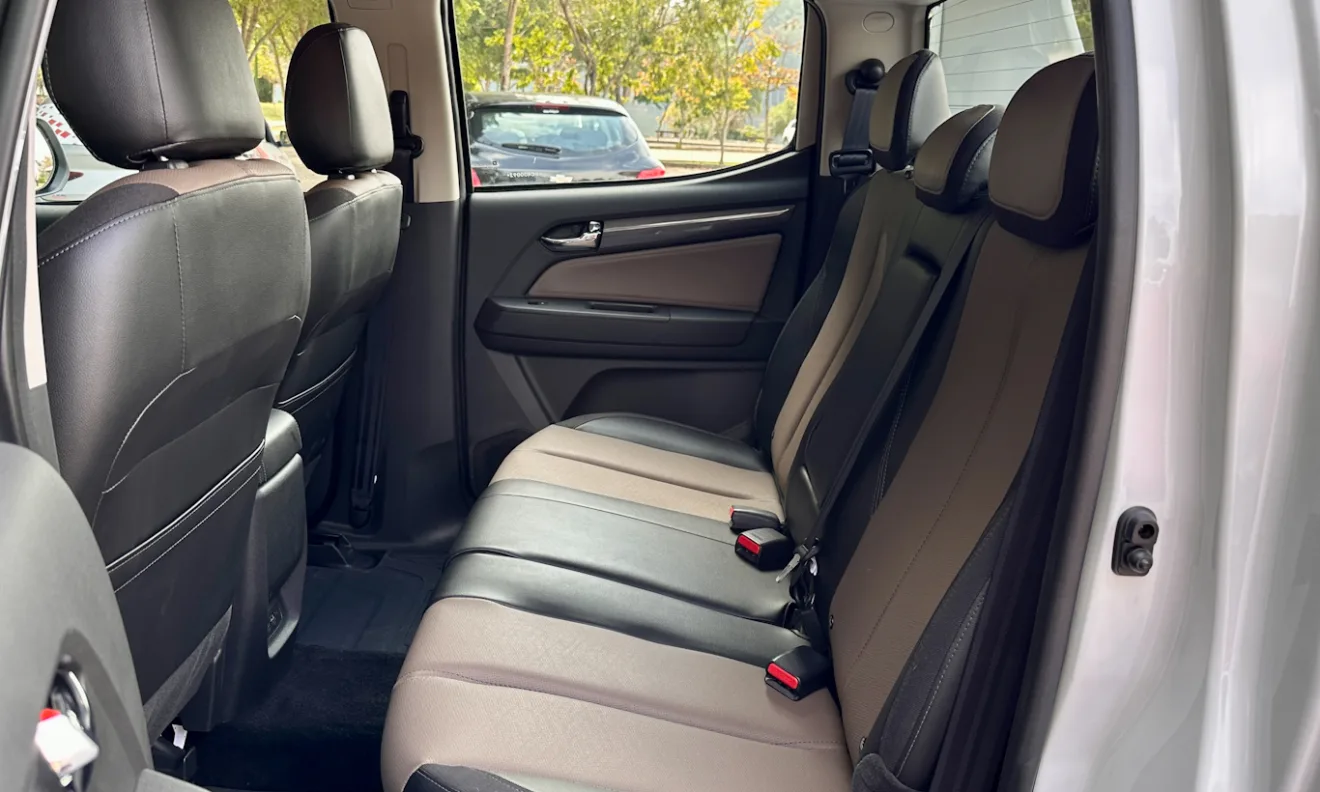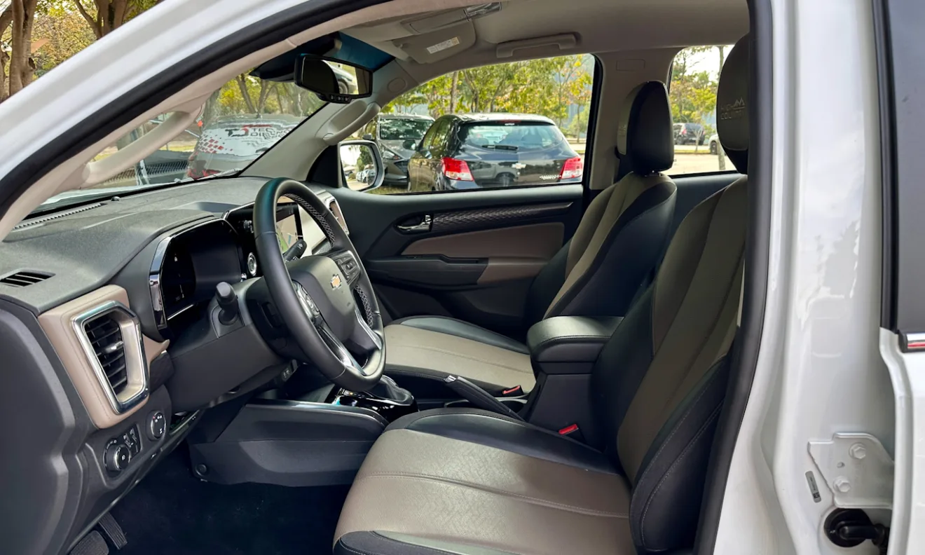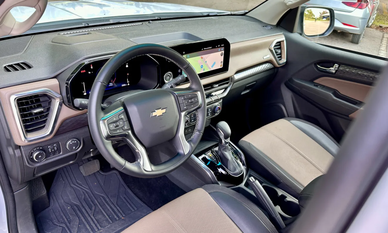 Por dentro, ela incorporou o tema Silveradinho. As linhas são horizontalizadas e bem fortes, com volante praticamente igual da irmã maior. Na High Country há uma larga faixa de couro marrom que adiciona um toque de sofisticação. É um acabamento melhor até do que o da Ford Ranger. Botões emborrachados e o couro do volante chamam atenção.
