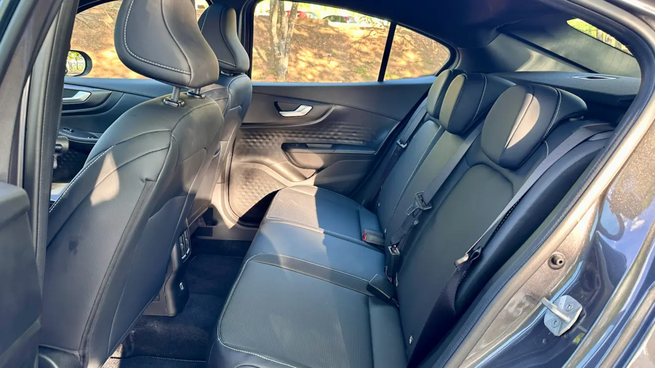 O teto é baixo na segunda fileira, sendo ainda mais atrapalhado pelo nicho da cortina. Além disso, quem senta atrás não tem revestimento de couro nas portas, exceto no apoio de braço. Há saída de ar e duas saídas USB, mas o espaço para uma pessoa no meio é muito limitado.