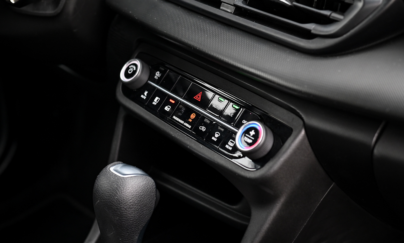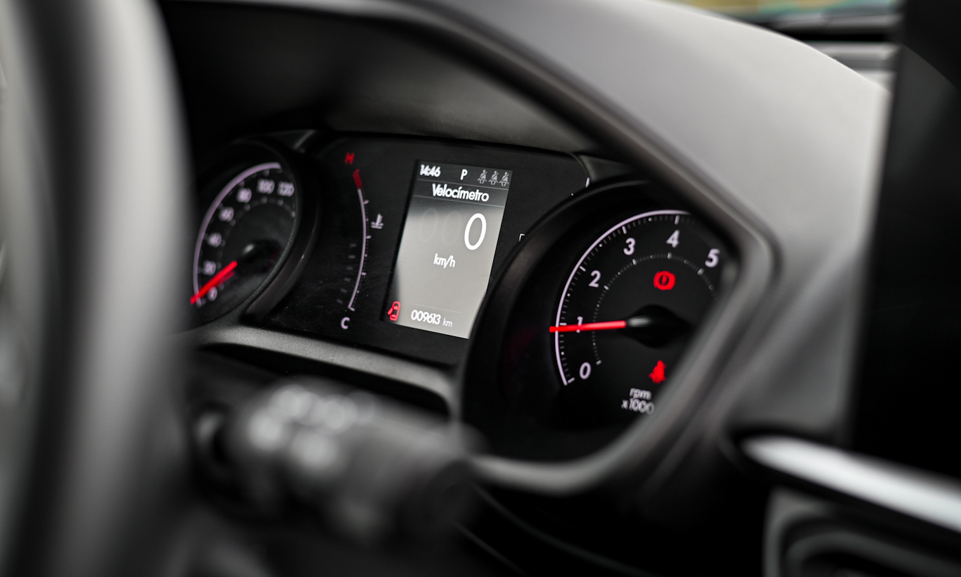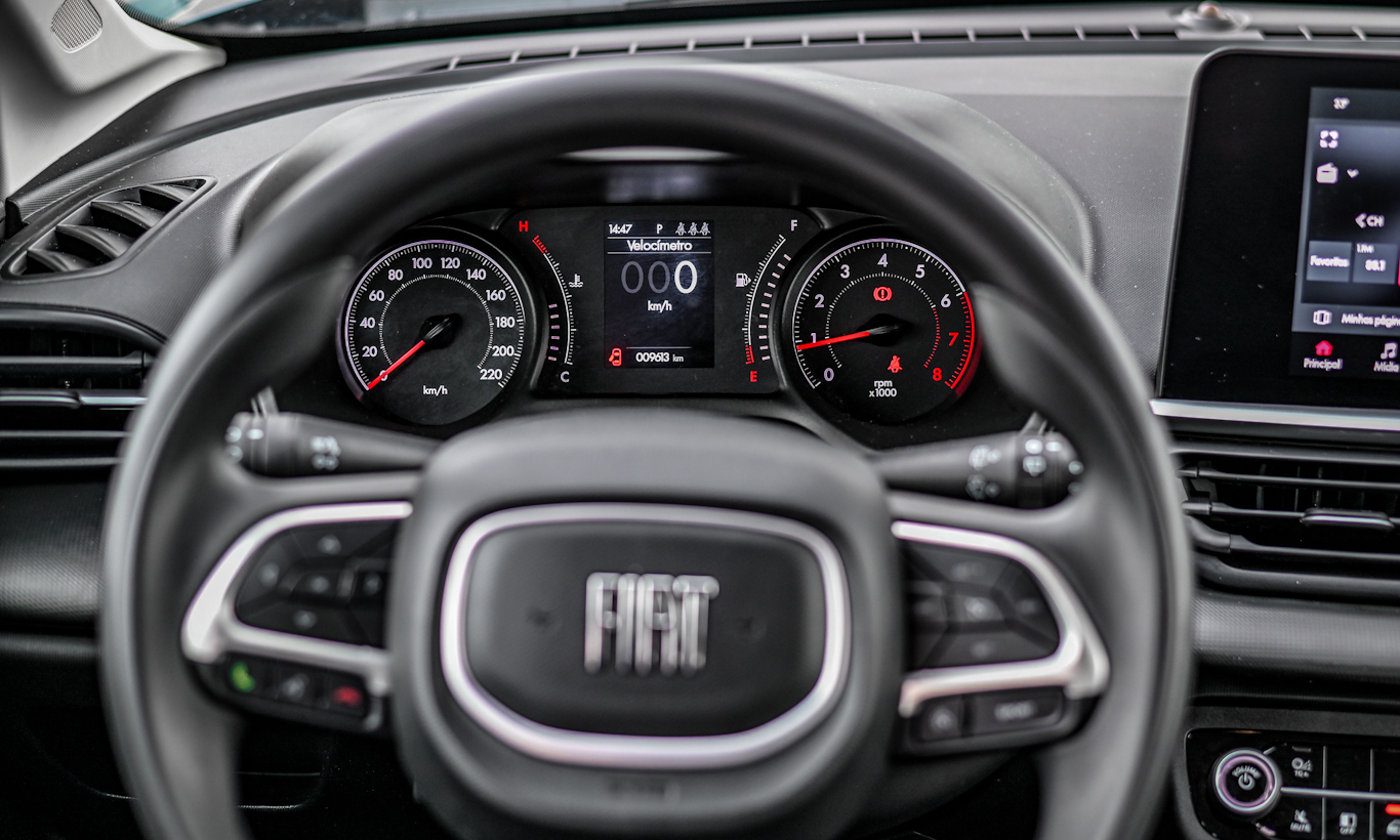 O tecido dos bancos é de qualidade e passa conforto, tal qual o material do volante que, pode não ser couro, mas é bem mais agradável ao tato que o do Chevrolet Onix, por exemplo. O painel de instrumentos é simples, mas tem uma boa tela central com diversas funções e prática de mexer pelos comandos no volante.