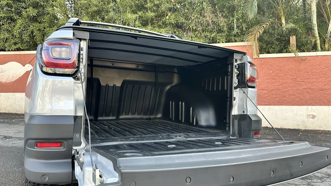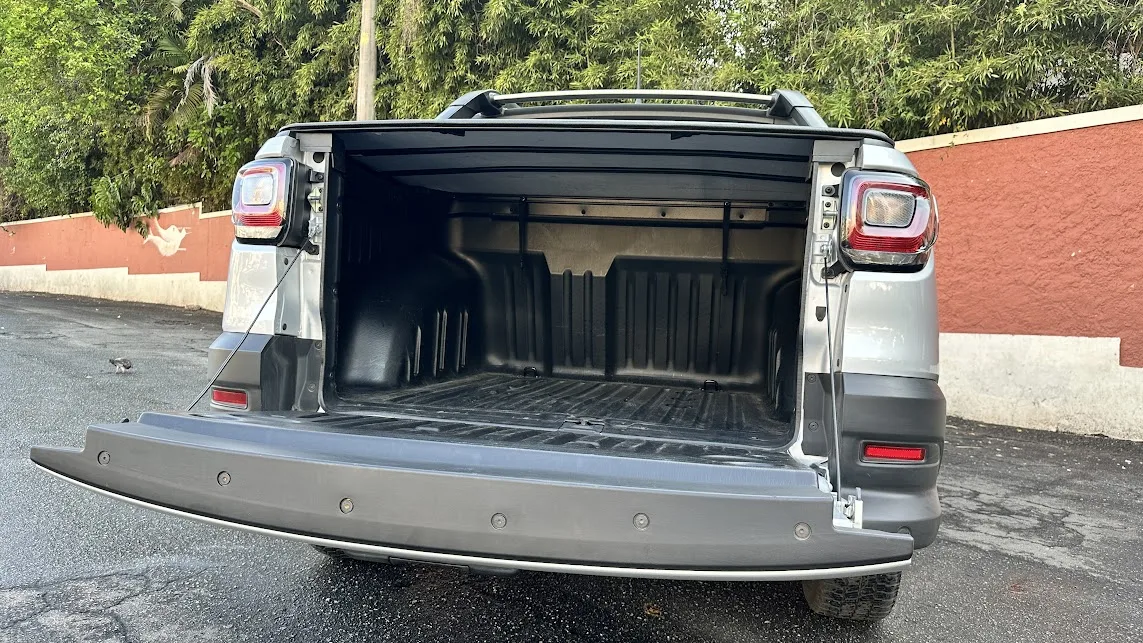 Projetada para suportar peso na caçamba (650 kg ou 844 litros), a tampa do compartimento de carga suporta até 400 kg e pode ser manuseada com uma mão por conta da leveza de operação. A área de carga mede 1,17 m de comprimento, 1,31 m de largura e 60,6 cm de altura.