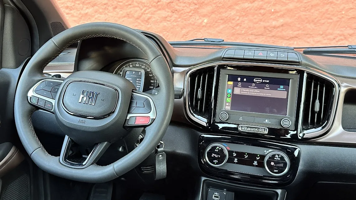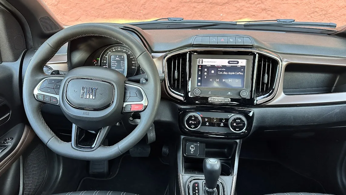 Em uma viagem com três adultos e uma criança para Pirassununga (SP), foi necessário empurrar o banco do carona para acomodar a cadeirinha, o que limitou o espaço para as pernas do ocupante frontal. O acabamento da Fiat Strada utiliza plásticos de boa qualidade e áreas revestidas nas portas, transmitindo uma sensação de maior requinte, embora o quadro de instrumentos analógico tenha um grafismo que poderia ser melhorado.