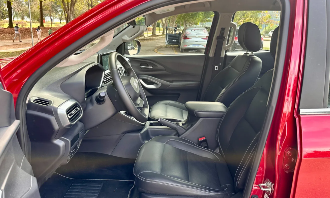 O acabamento melhorou em relação a antes, com uso de botões emborrachados no painel, faixa larga de couro, materiais de melhor qualidade e um estilo mais moderno. Mas se você olhar para a porta terá uma sensação de 2012. Até porque só mudaram a textura do friso superior. Fica estranho o estilo moderno de 2024 de um lado junto ao outro de 12 anos.