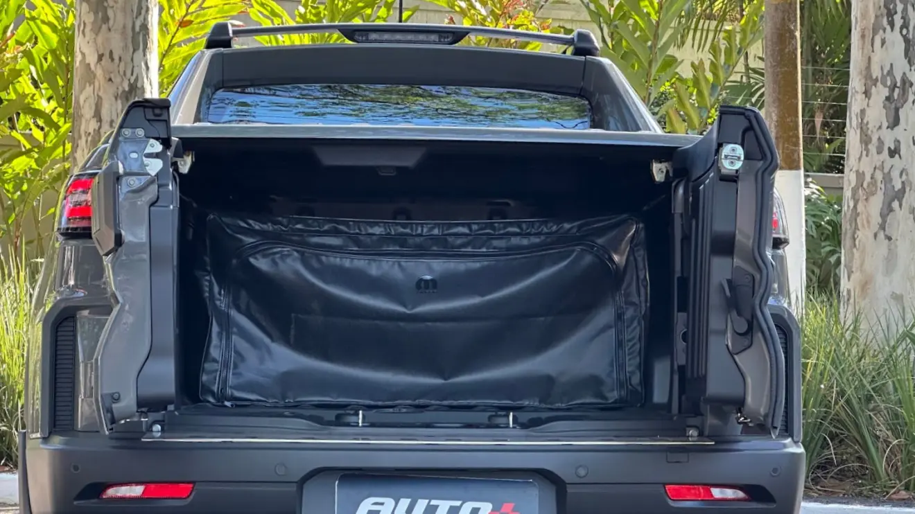 O acesso à caçamba é feito pelas duas portas, enquanto o diferencial da configuração Ultra fica na cobertura rígida da área dedicada ao transporte de carga. Além de reforçar o estilo, a cobertura protege melhor contra água e poeira, sendo leve para abrir ou fechar. A bolsa com zíper da Mopar ainda facilita a organização e proteção das cargas.