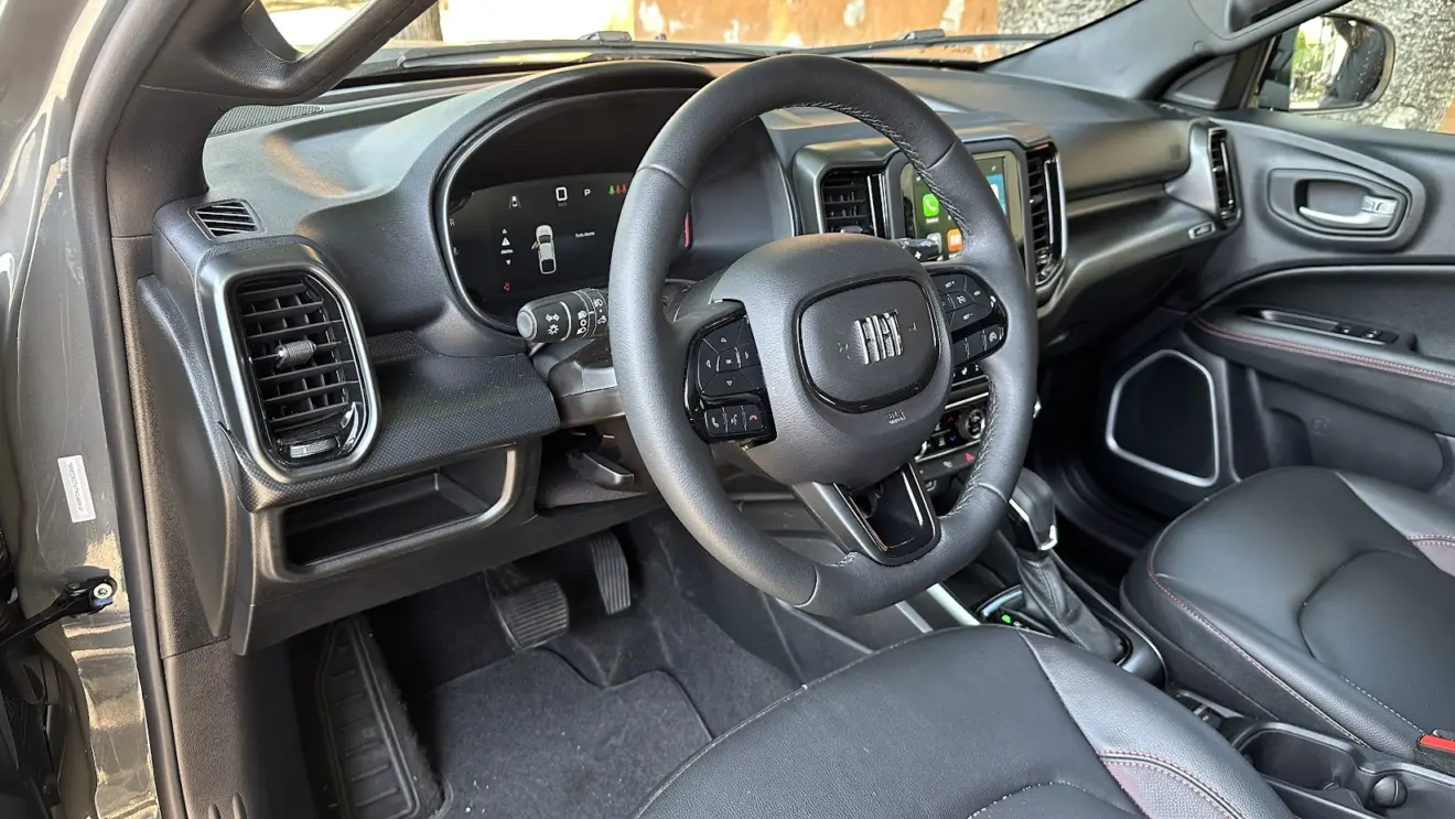 O perfil 60 dos pneus ajuda o conjunto de suspensões a absorver melhor as irregularidades, enquanto o desenho das rodas de liga leve deixa à mostra os freios a disco nas quatro rodas. Uma novidade da linha 2026 da Fiat Toro, que também trouxe o freio de estacionamento eletrônico.