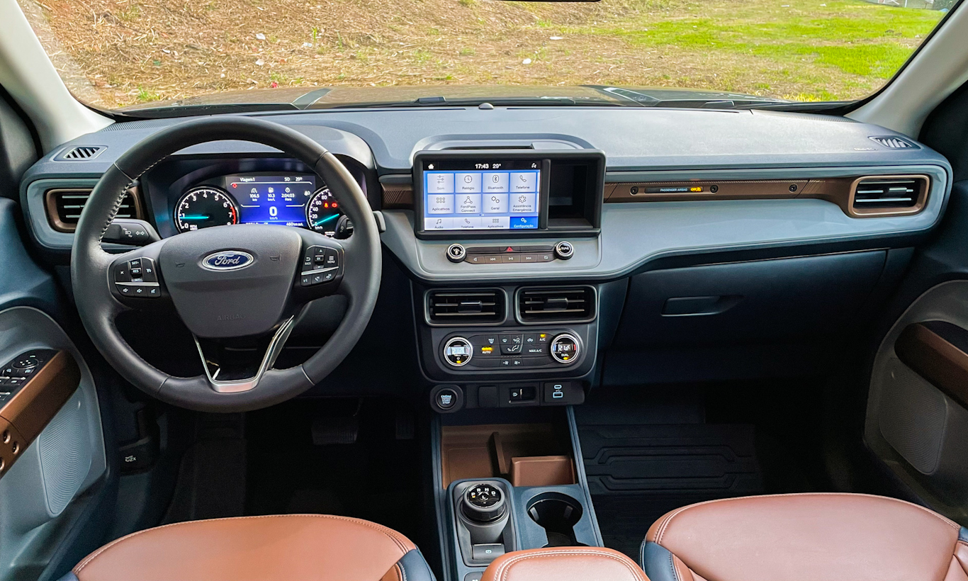 O mais legal da Ford Maverick é, sem dúvida, seu interior. A marca do oval azul investiu tempo e criatividade dos designers ali. A picape tem plásticos de qualidade boa e nada de material macio ao toque. Condizente com um modelo com caçamba.