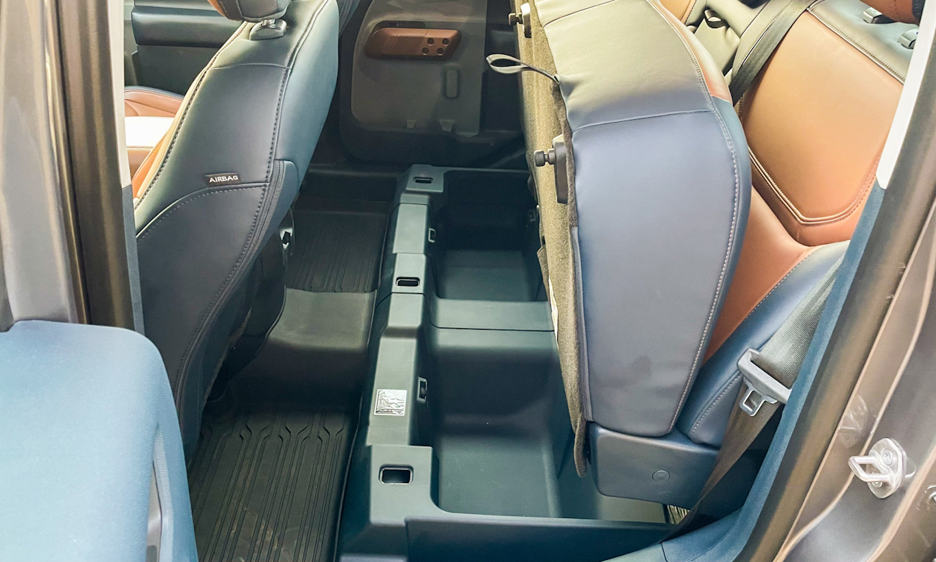 [Auto+ / João Brigato]Ela é cortada para que uma garrafa d’água caiba perfeitamente dentro do espaço da porta. Há ainda um compartimento secreto atrás do espaço para garrafas. Outro alçapão abaixo do banco traseiro também serve para esconder coisas tal qual as duas gavetas na caçamba.O espaço é bom na dianteira e na traseira. Mas a sensação de amplitude é elevada por conta dos pilares retos e janelas grandes. O interior é arejado e se não bastasse, a janela traseira que dá acesso a caçamba pode ser aberta ao apertar de um botão.
