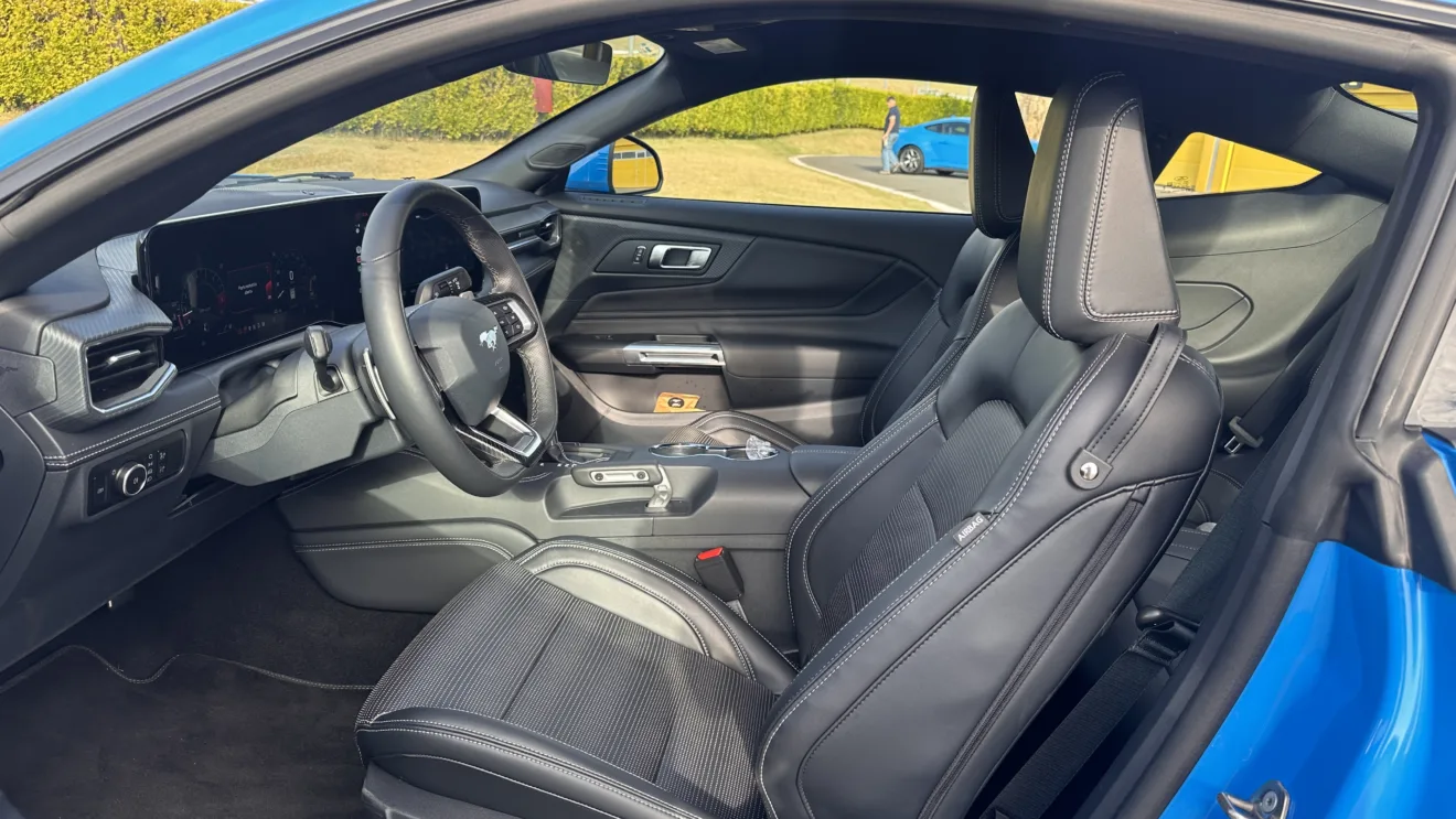 O acabamento não é de um carro premium, mas está quase lá. O Mustang tem muitas superfícies macias e locais revestidos em couro. Nessa geração, há mais peças em comum com outros Ford do que havia anteriormente, como as hastes de comando atrás do volante e botões de portas. Atrás, o espaço é apertadíssimo e quase decorativo.