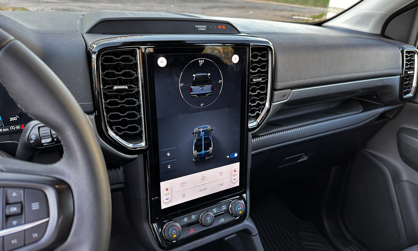 Por lá também é possível controlar diversos aspecto do carro e também ter acesso a um modo off-road em que a Ranger exibe inclinômetros, funcionamento da tração e a câmera dianteira para ajudar a passar por obstáculos. Há ainda câmera 360° a qual auxilia muito nas manobras e tem boa definição (ao contrário do Volvo XC60 testado na semana passada).
