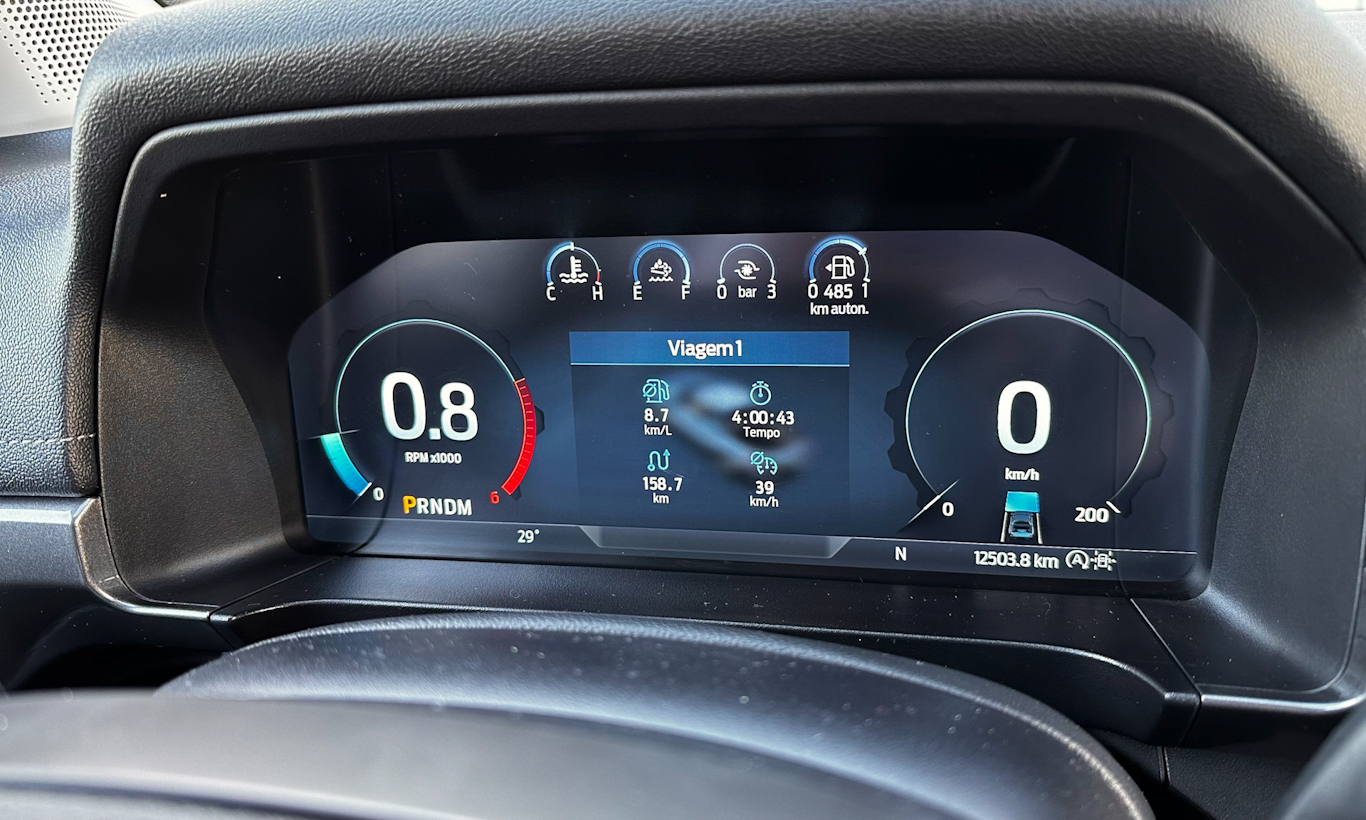 A qualidade da tela é notável e a quantidade de informações é bem completa. Pena que a Ford não deixou uma opção de layout com ponteiros analógicos, visto que os elementos digitais com números gigantescos combinam com um carro elétrico, não com uma caminhonete com motor V6 diesel.