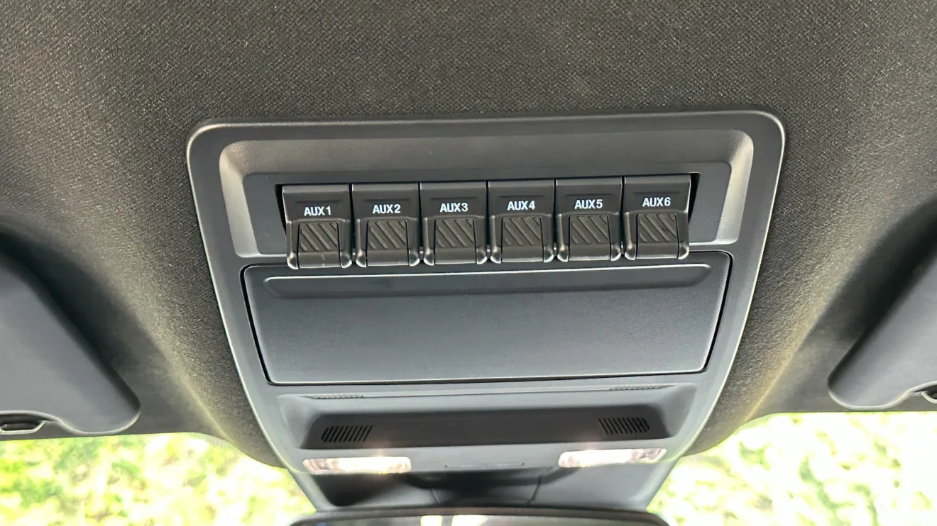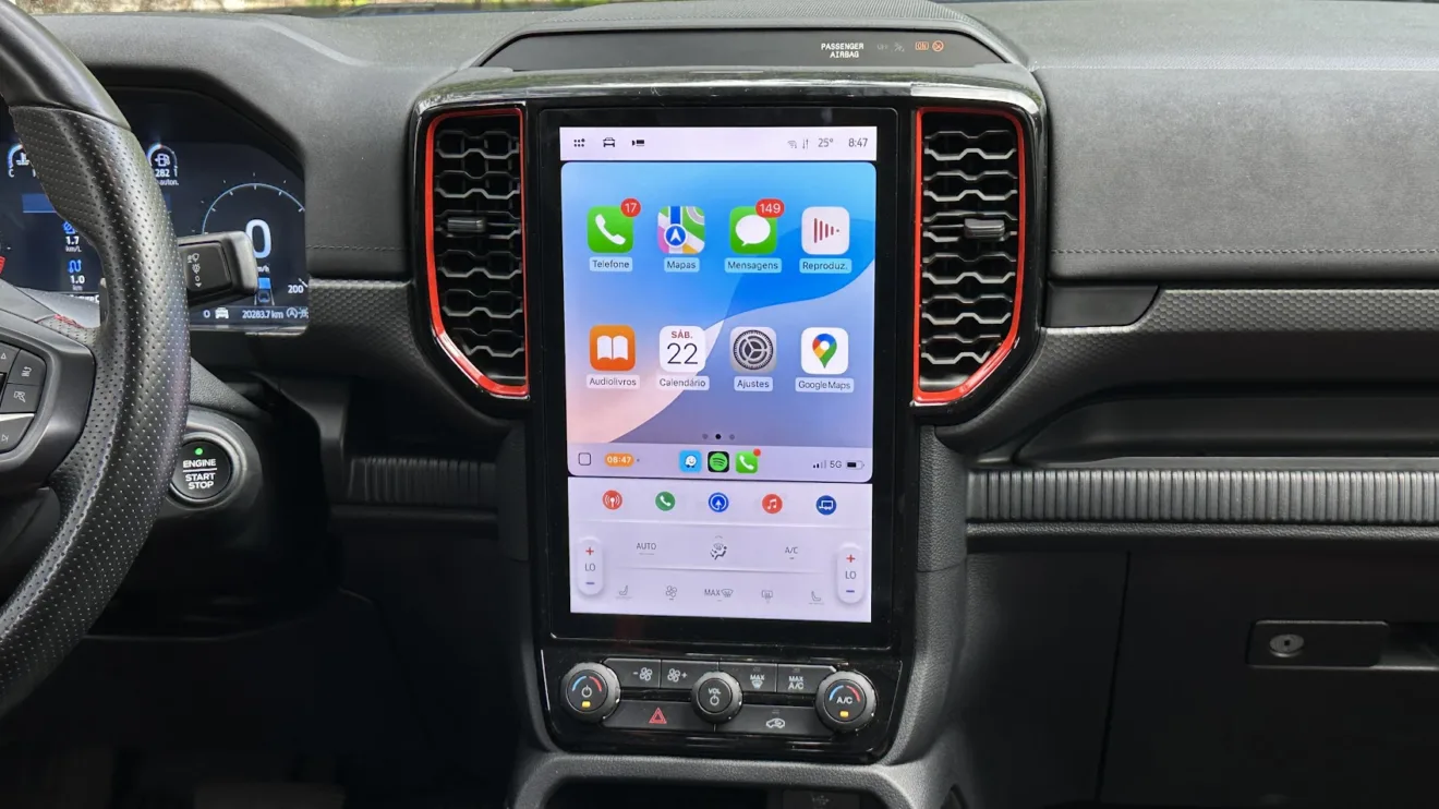 Há ainda a coluna de direção ajustável em altura e profundidade, seis botões extras para ligar equipamentos e acessórios instalados posteriormente, carregador de smartphone por indução, entradas USB-C, multimídia vertical de 12,3 polegadas com Android Auto e Apple CarPlay sem fio.