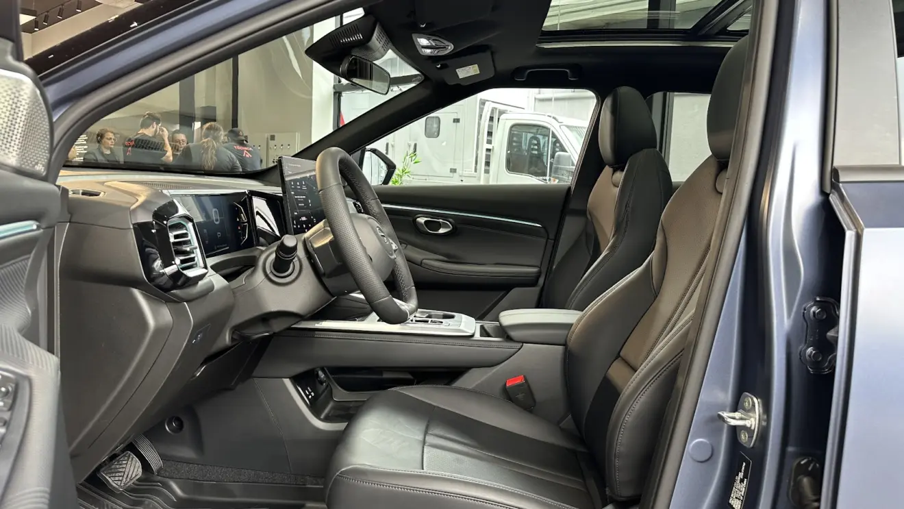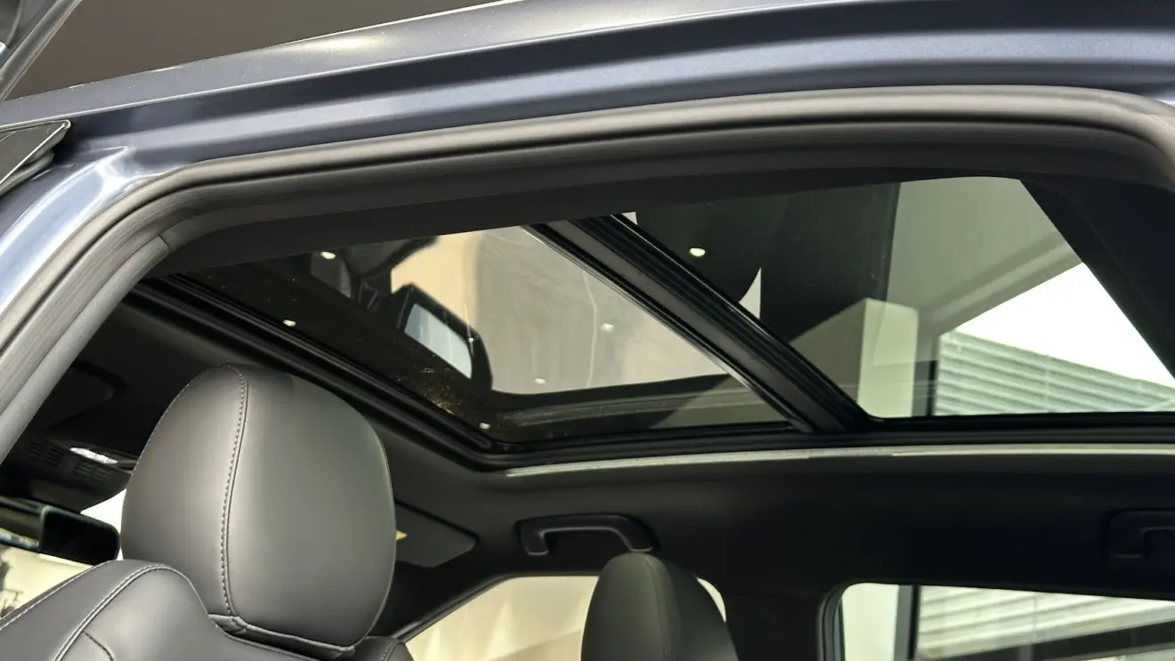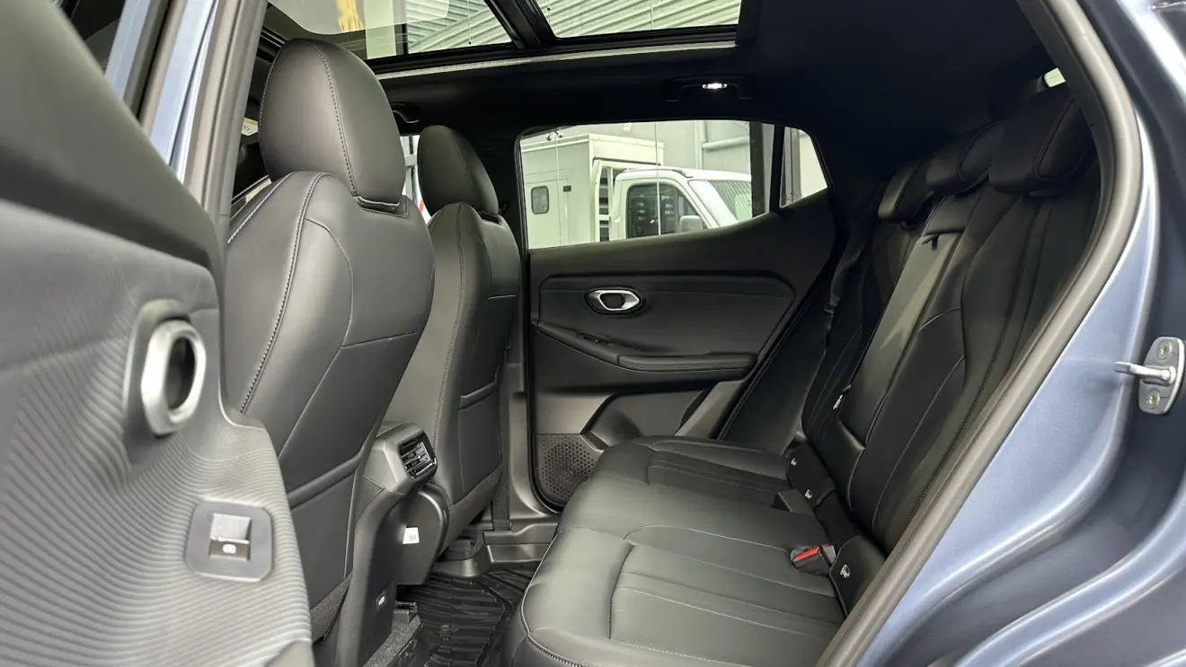 À frente dos olhos está o quadro de instrumentos de sete polegadas, enquanto o conjunto de telas é complementado pelo multimídia de 14,6 polegadas com conectividade Android Auto e Apple CarPlay sem fio. A boa habitabilidade é reforçada pelo teto solar panorâmico, assim como o assoalho traseiro plano. Aliás, o entre-eixos de 2,65 m assegura um bom espaço para as pernas e os joelhos. Há saída de ar dedicada.