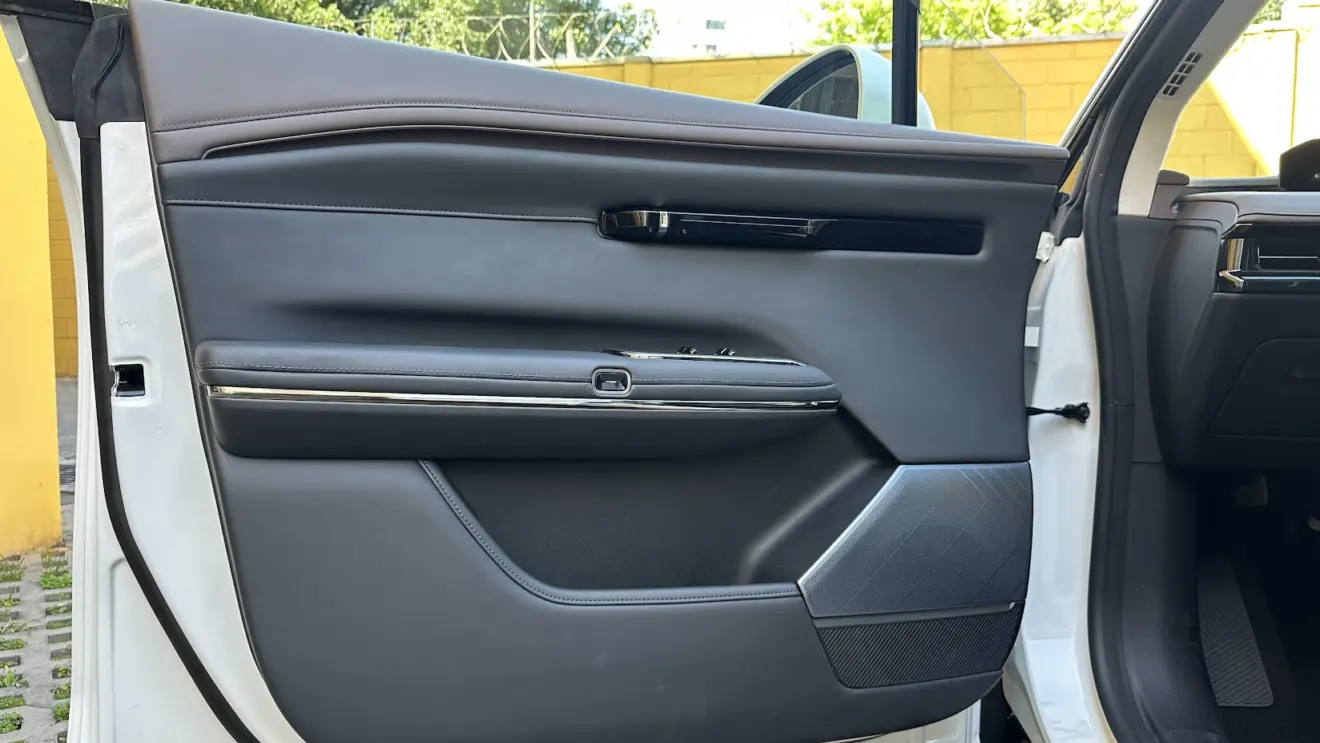 Isso facilita para quem viaja atrás definir uma distância confortável quando o passageiro da frente não está presente. Outras particularidades estão na mesinha de avião e no apoio de pés, além de não haver maçanetas convencionais, pois a abertura é feita por meio de um botão instalado nas laterais das portas. O teto solar panorâmico conta com tratamento térmico, e a abertura e o fechamento da persiana, adivinhe, também são controlados pelo multimídia.