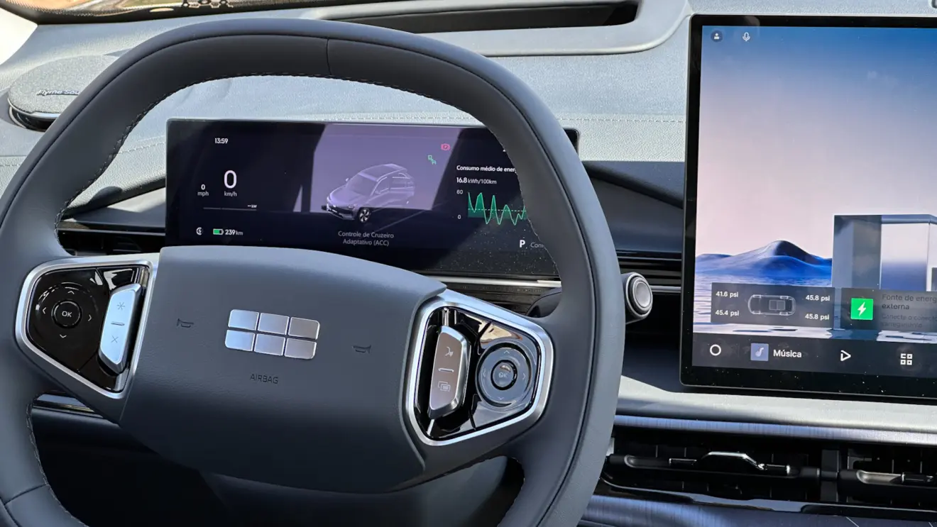 Por dentro, é a fórmula de todo carro chinês: telão gigante (15,4 polegadas) para a central multimídia e painel de instrumentos digital (10,2 polegadas). O volante tem dois aros, o console central é alto e o acabamento é impecável. Tudo que todos os carros chineses fazem hoje em dia. Não há nada de diferente em termos visuais.
