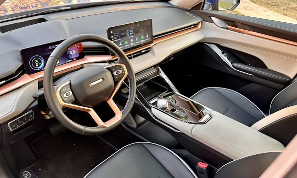 Por dentro, o acabamento é muito bem feito. Toda superfície superior na cor preta do painel é macia ao toque, inclusive nas portas dianteiras. Na versão PHEV19, a GWM adicionou couro off-white (um branco levemente amarelado) como material contrastante no painel, console e parte dos bancos.