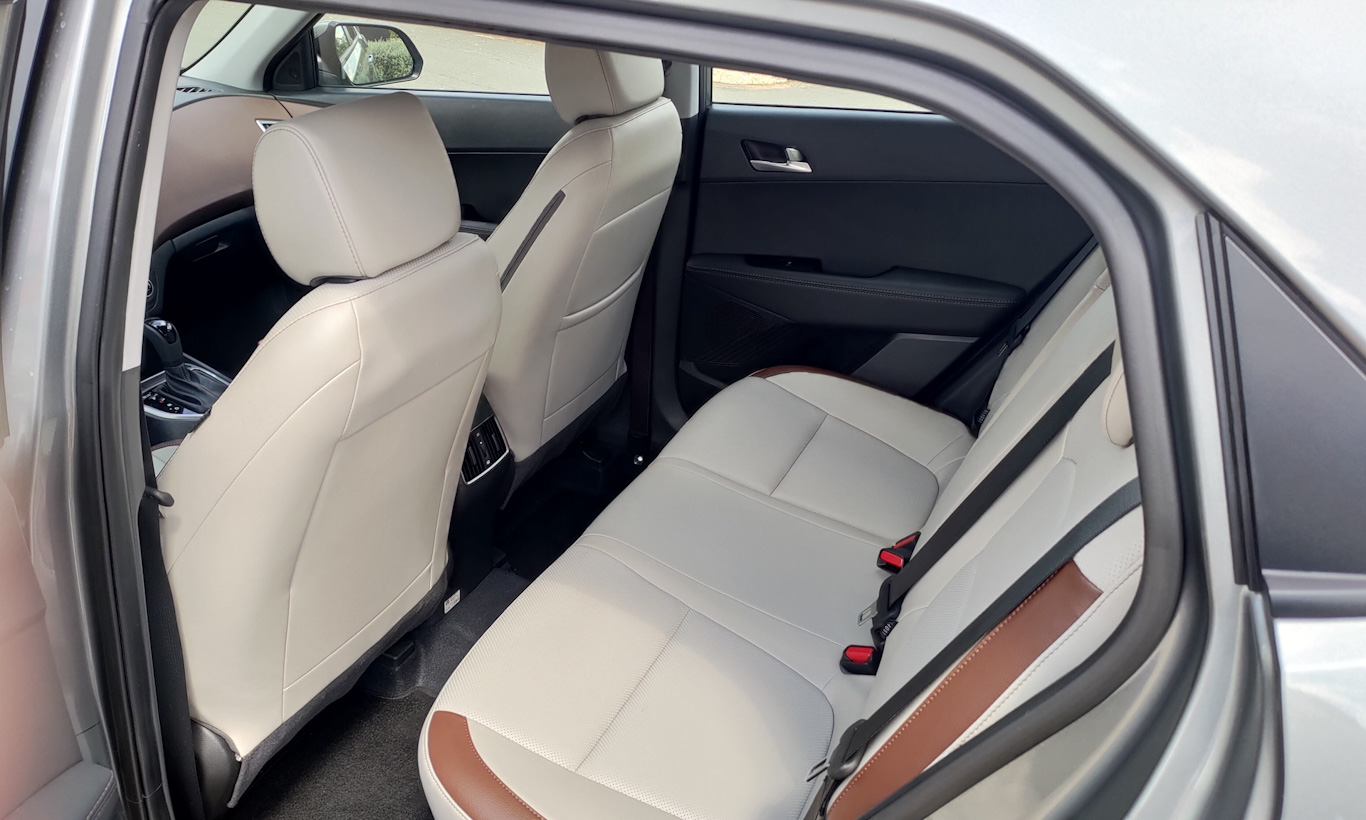 Ele é feito sobre a mesma plataforma do Elantra, o que dá a ele medidas mais generosas. São 4,27 m de comprimento, 1,78 m de largura, 1,63 m de altura e 2,59 m de entre-eixos. Isso se traduz em espaço interno farto. A segunda fileira de bancos, por exemplo, tem boa área para as pernas e ainda permite inclinar o encosto de maneira confortável.