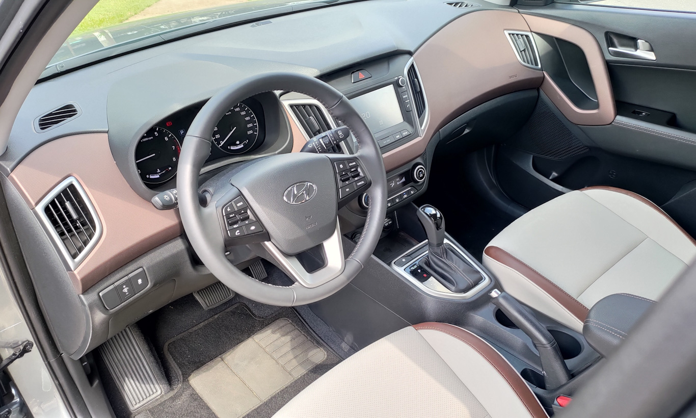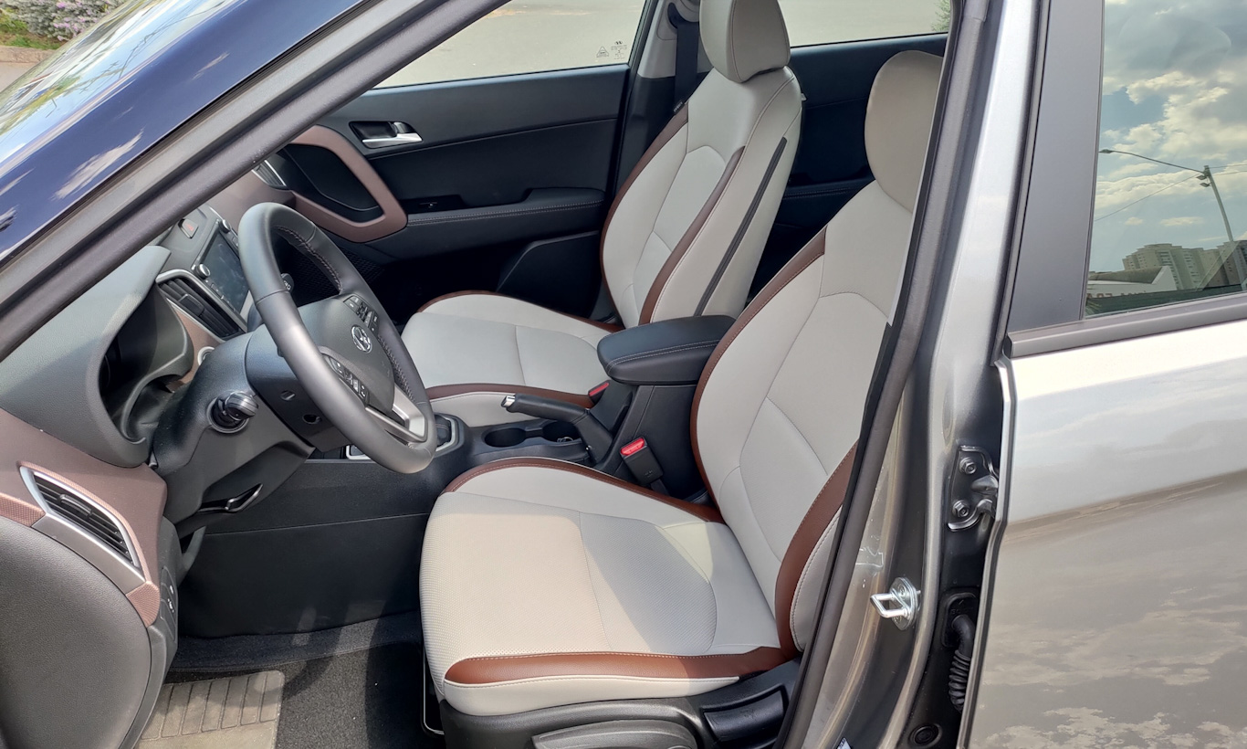Enquanto a cabine do Hyundai HB20 Diamond Plus peca pelo excesso quase cafona de marrom, a marca sul-coreana resolveu ser mais contida e elegante no Creta. Ele tem boa parte dos plásticos pintados em preto, mas traz a parte central do painel em marrom texturizado, assim como os puxadores das portas.