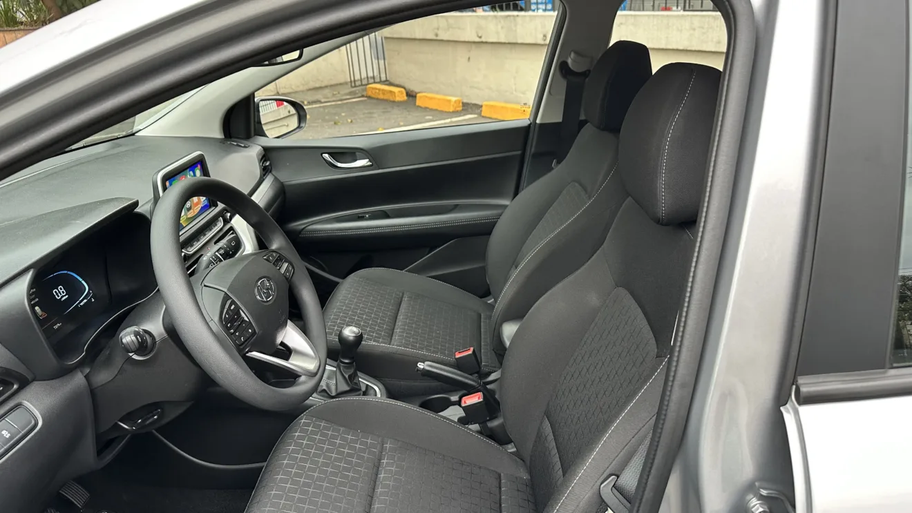 O plástico predomina, mas tem boa aparência, sem transmitir um aspecto de projeto de baixo custo. O descansa braço dianteiro é regulável e macio. O porta-luvas poderia ser maior e ter iluminação, enquanto a regulagem dos bancos é manual.