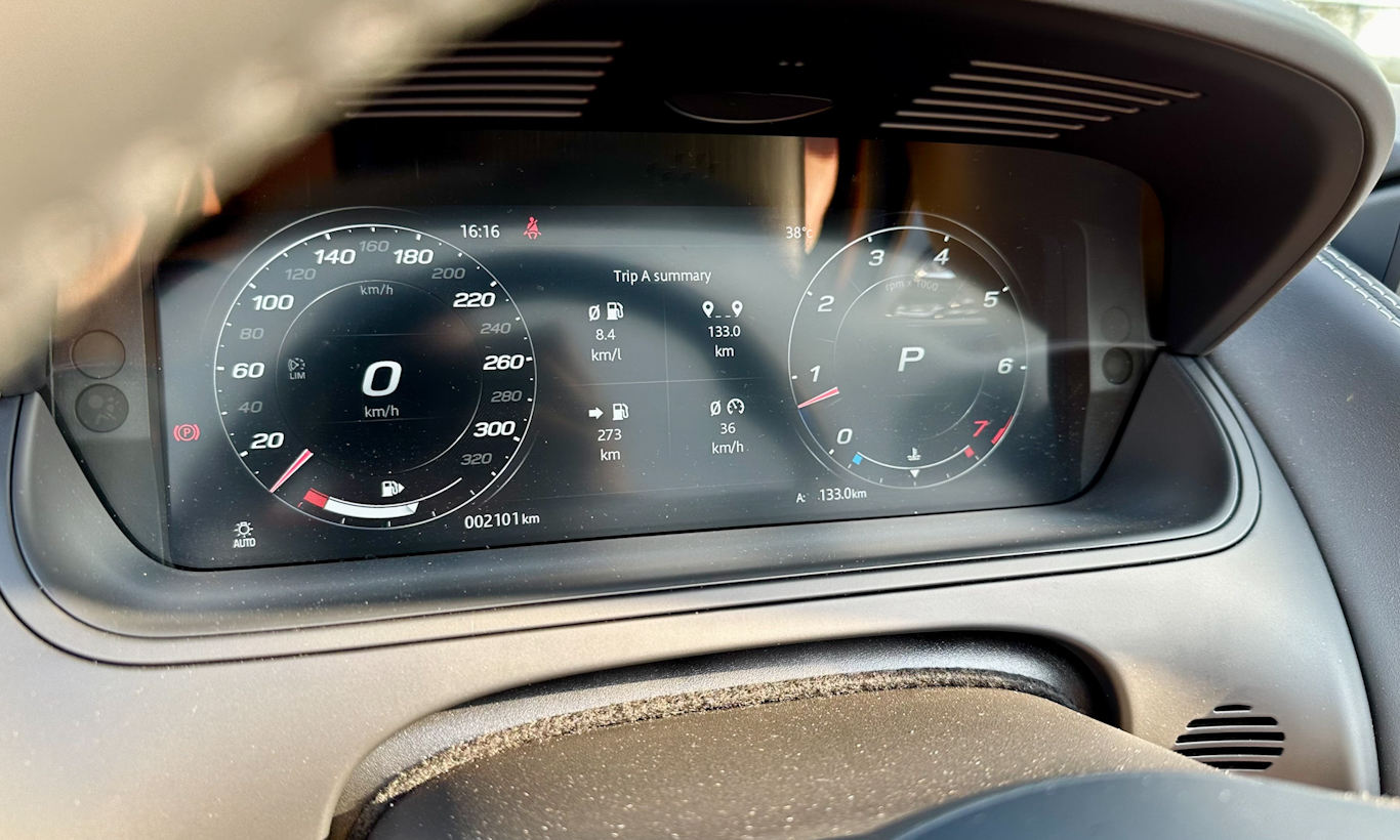 Na última atualização, o esportivo recebeu painel de instrumentos totalmente digital de ótima qualidade e personalizável. Dá até para deixar o mapa em uma das laterais do painel. Temos ainda central multimídia atualizada com uso facilitado e boa definição. A película que permite usá-la mesmo de capota aberta, contudo, deixa a tela mais opaca e sem vida.