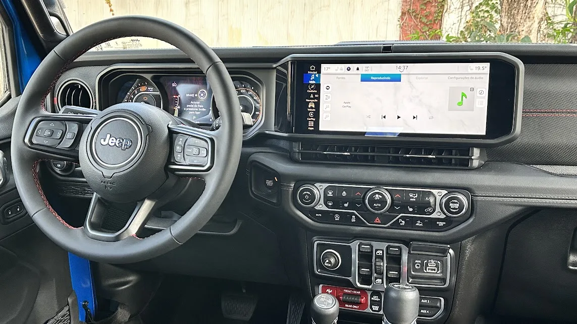 O Jeep Wrangler é rapidamente vestido, com o banco do motorista eletricamente ajustável. À frente dos olhos está o quadro de instrumentos com tela de sete polegadas, e uma novidade é a introdução da nova multimídia de 12,3” horizontal, com Apple CarPlay e Android Auto sem fio. Antigamente, a tela era quadrada.