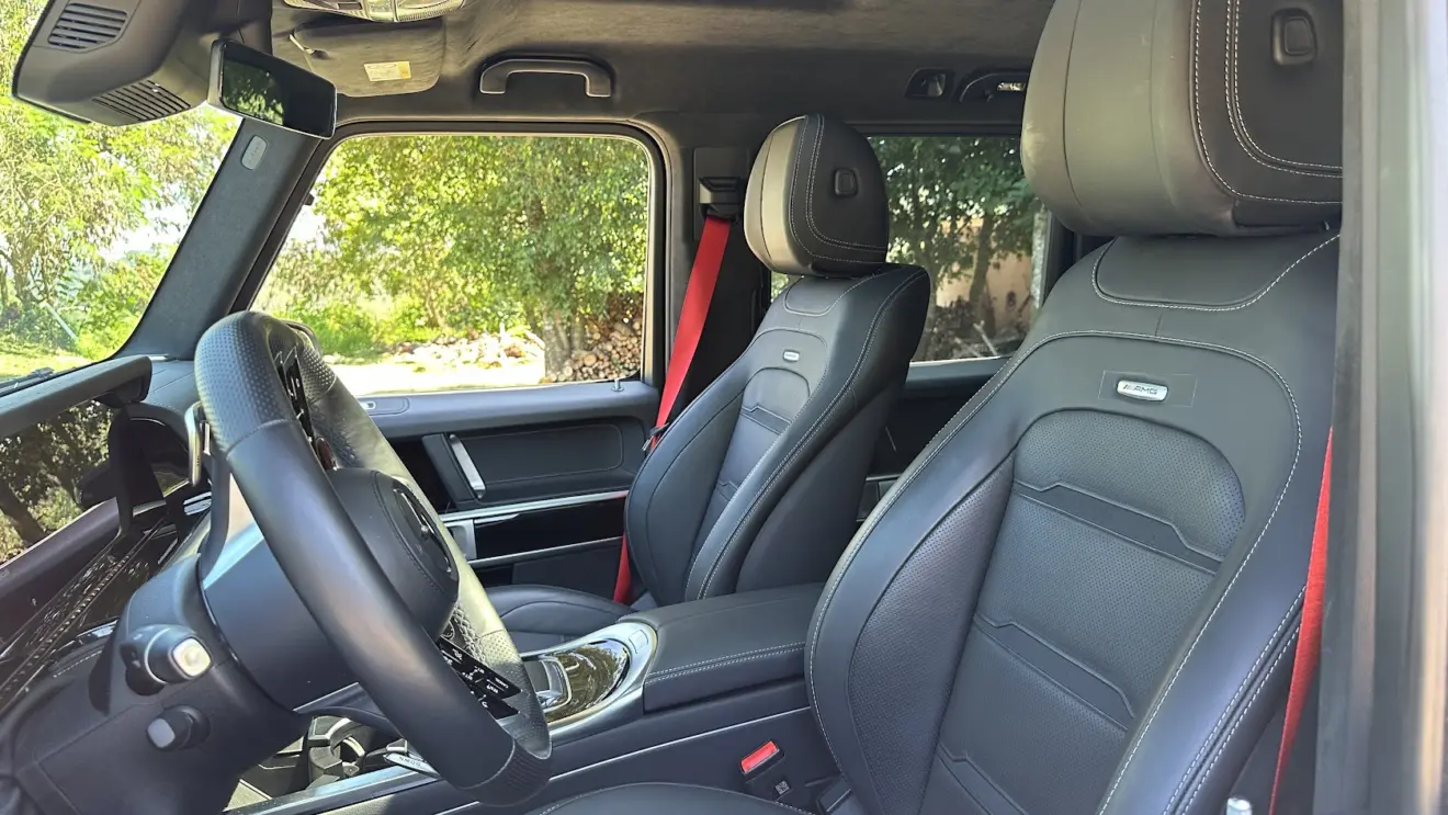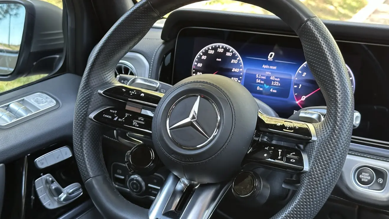 Aliás, embarcar no Mercedes-AMG G 63 é diferente de entrar em um Porsche Cayenne. Primeiro, o clique da maçaneta é algo que nunca pode mudar, assim como o barulho seco da batida de porta, com as dobradiças expostas. Uma vez dentro, você dirige enxergando o capô, como em todo jipe, enquanto o para-brisa fica mais próximo. Os bancos frontais seduzem pelo conforto e pela forma que te abraçam.