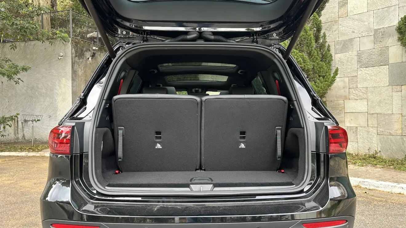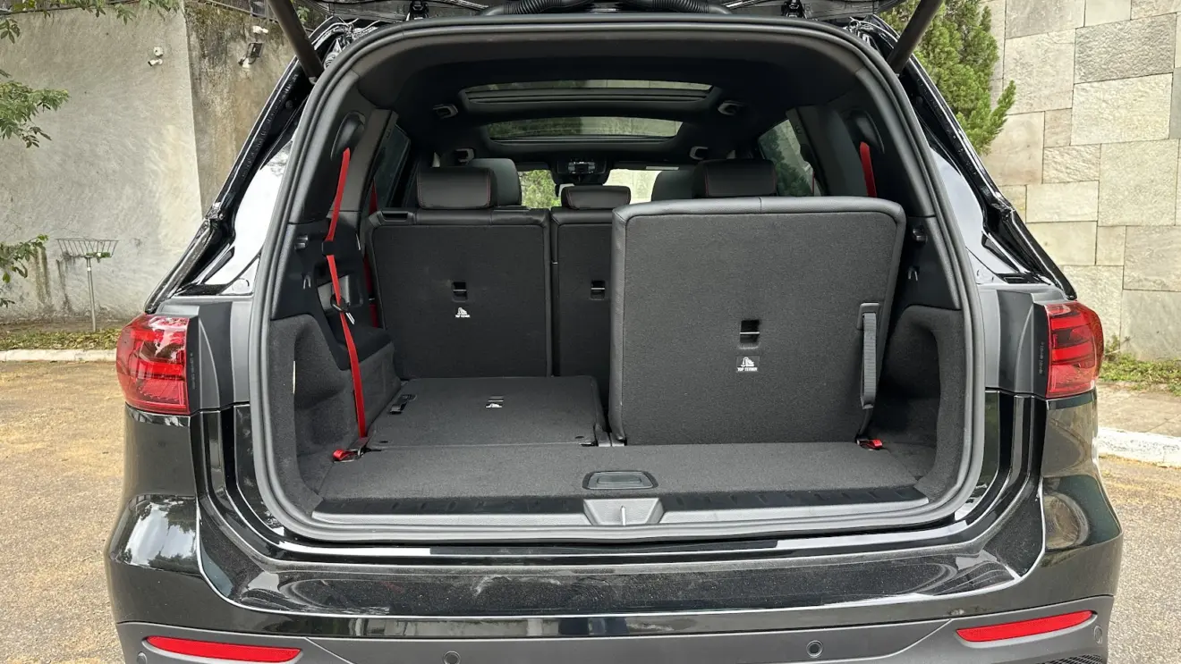 Quem viaja atrás encontra um bom espaço para as pernas e os joelhos por conta do entre-eixos de 2,82 m, da mesma forma, que o encosto é rebatível para ajudar no acesso à terceira e última fileira. O teto solar duplo coopera na sensação de contato com o meio externo. E o mesmo padrão de acabamento na porção frontal da cabine é repetido para os ocupantes traseiros, que, aliás, encontram saídas de ar dedicadas.