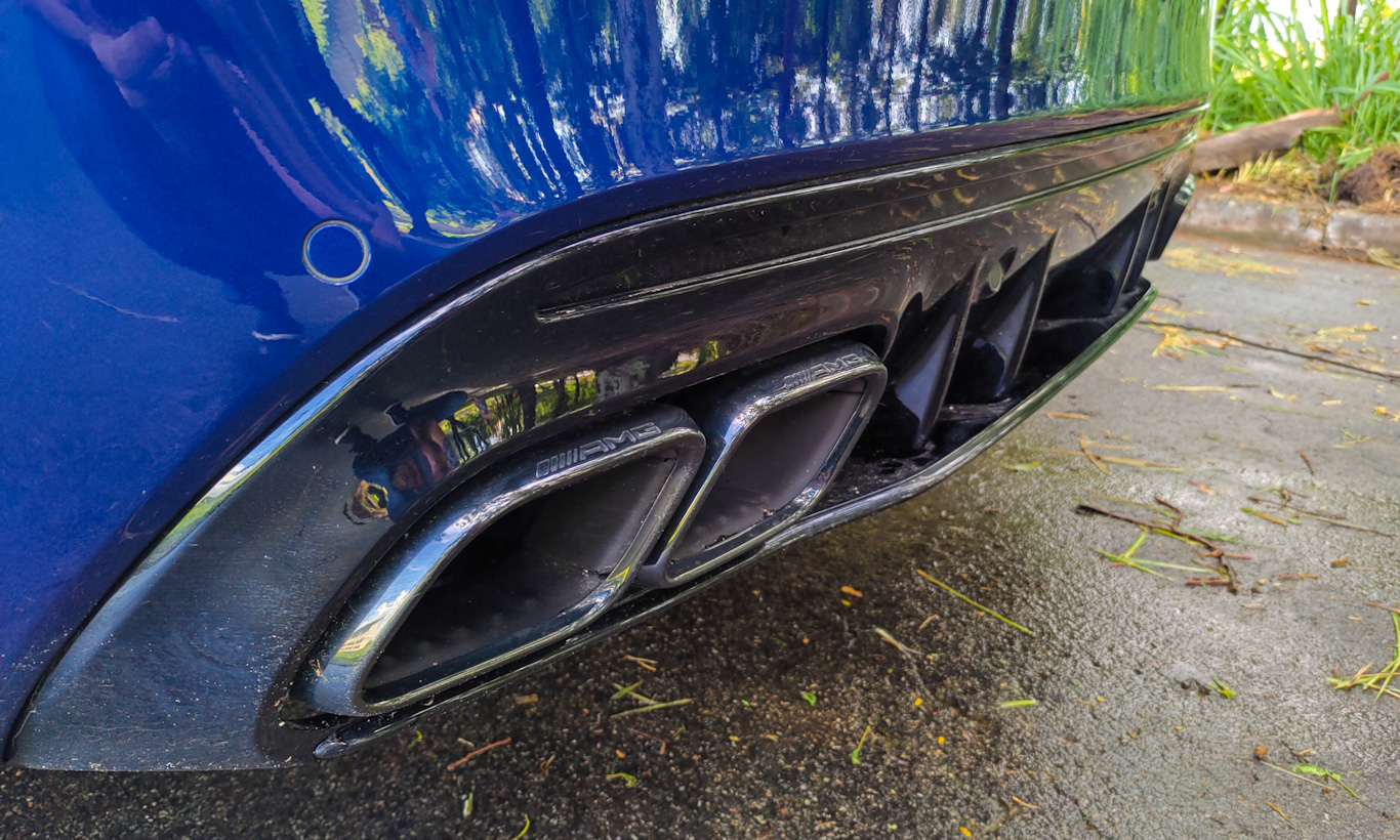 Para deixar as coisas mais interessantes, todo Mercedes-Benz C 63 AMG S como eu tem sistema de escape ativo. É assim: se você apertar um botão no meu volante ou no console central, o sistema fica menos restritivo e mais barulho sai lá de trás. Se estiver em Sport+ então, nas reduções de marcha, é capaz de escutar uns estouros enquanto todo mundo dentro da cabine abre o maior sorrisão.