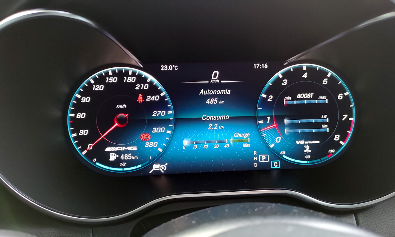Tento compensar essa falha com um painel de instrumentos digital totalmente configurável e com diversos elementos diferentes. Até dá para personalizar os visores. Tenho também iluminação ambiente com milhares de cores configuráveis. Vai dizer que isso não é chique até para um C 63 AMG S?