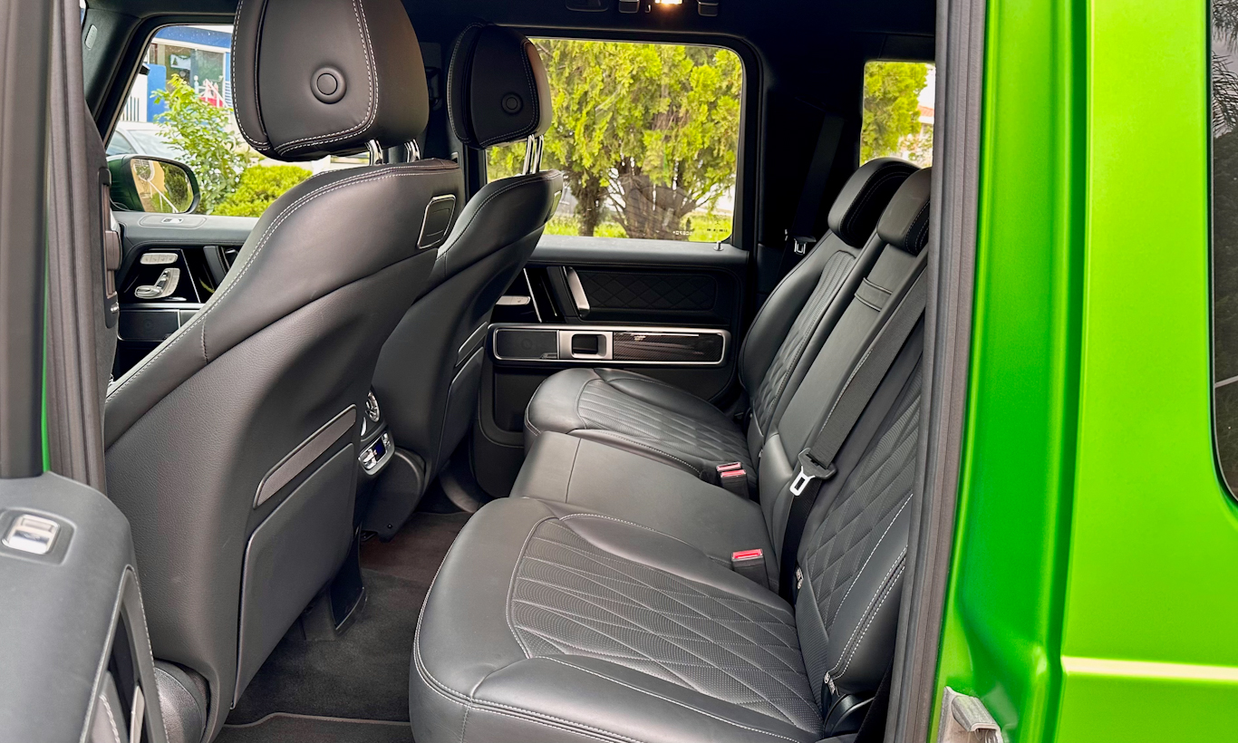 Os assentos do G63 AMG merecem um capitulo a parte. Começa pelo conforto inegável esperado por um carro caro assim. Passa pela regulagem elétrica em diversos elementos para os bancos dianteiros, inclusos o encosto de cabeça que é ajustado eletricamente. Há ainda aquecimento e resfriamento.