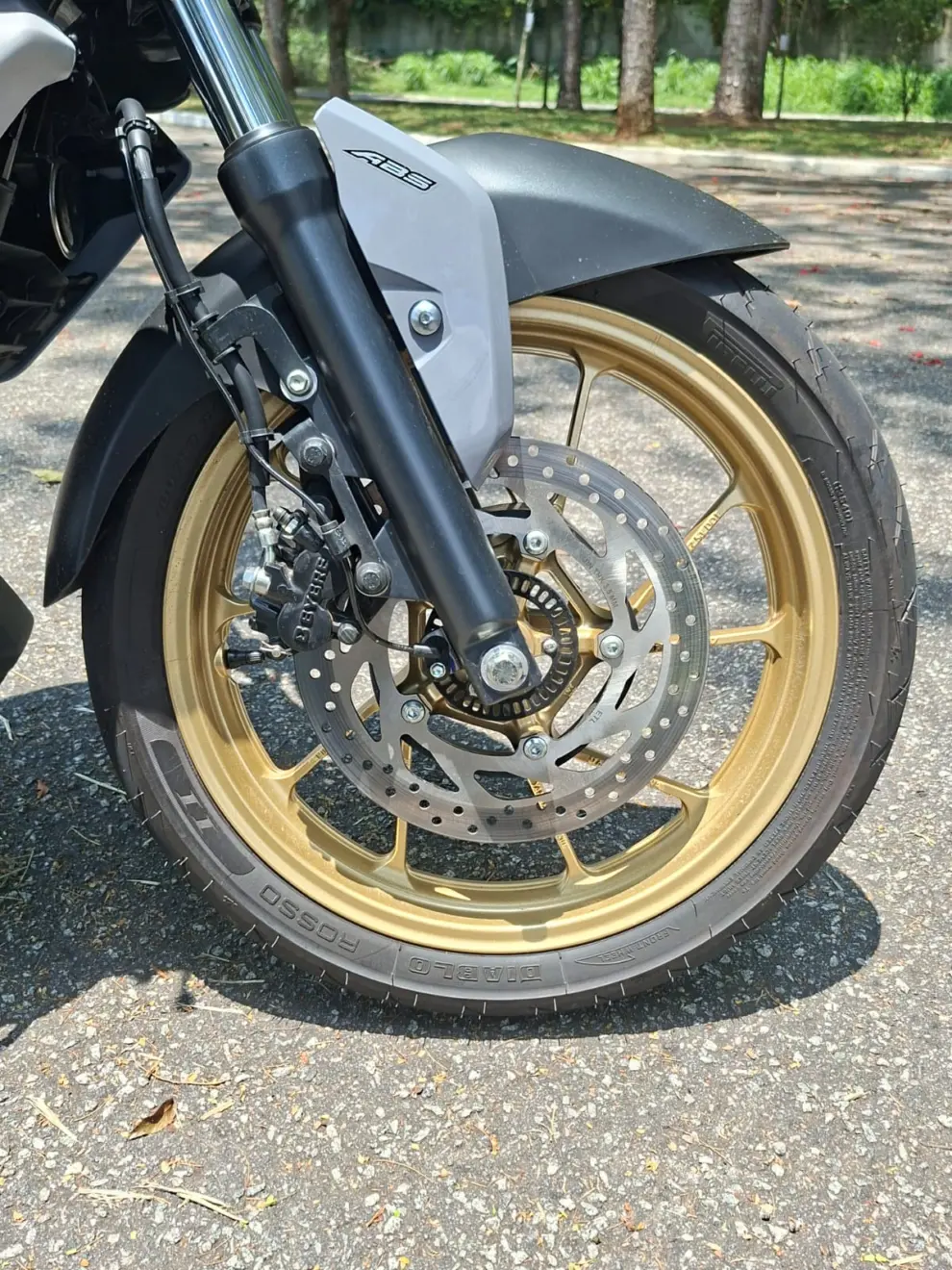 No sistema de freios, a Yamaha adota disco nas duas rodas — o que também é elogiável nessa categoria — , com ABS atuando apenas na dianteira. É uma solução que cumpre a legislação e oferece um ganho real de segurança em frenagens de emergência, especialmente em vias urbanas de baixa aderência. Embora não seja o sistema mais sofisticado do mercado, entrega o necessário para a proposta da moto.