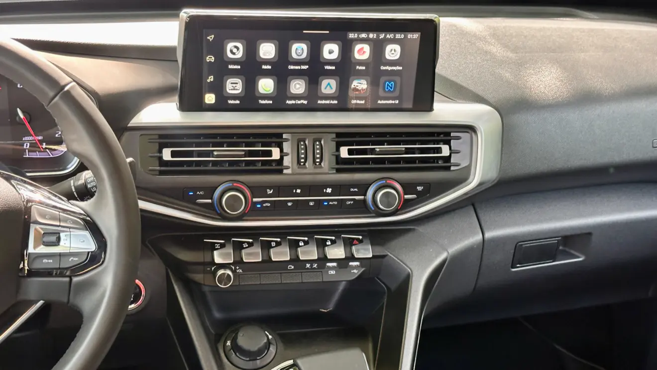 O ar-condicionado digital de duas zonas tem comandos físicos, ao contrário do regular dos Peugeot. Além disso, temos porta-copos grandes no console e um porta-copos direto na saída de ar para refrigerar a bebida. O espaço no painel para o celular não é adequado e fica atrapalhado pelo seletor de tração.