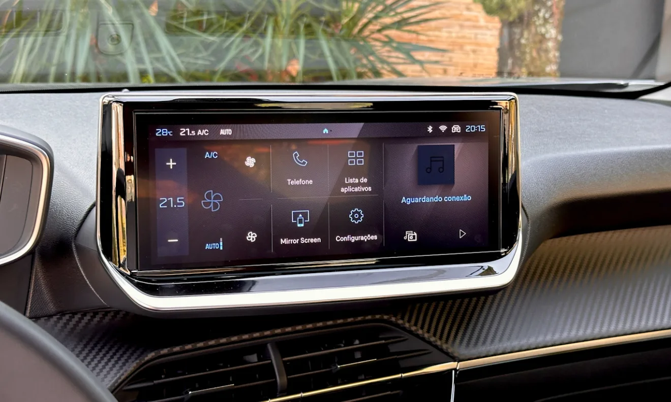 A central multimídia é bem boa e fácil de mexer. Por sorte, a marca ouviu as críticas e colocou um botão de acesso rápido para o ar-condicionado e um rotor físico para controle do volume do rádio. Em relação ao 208, o 2008 ainda traz freio eletrônico, resfriamento no carregador por indução, teto solar panorâmico que abre e paddle-shifts.