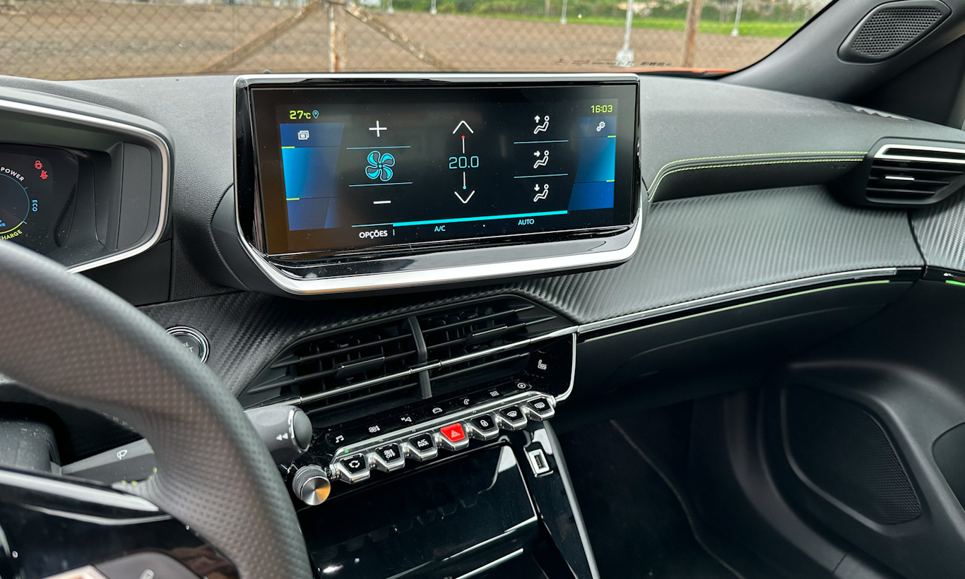 Pena que a Peugeot ainda não usa a central multimídia de nova geração que já está no 208 e no Citröen C3 para o nosso mercado. A do e-2008 é boa, mas mais antiga, um pouco lenta e deixa parte do Android Auto e do Apple CarPlay cortados e ainda conectados por fio. Além de ser irritante ter que sair do espelhamento toda vez que se faz necessário mexer no ar-condicionado.